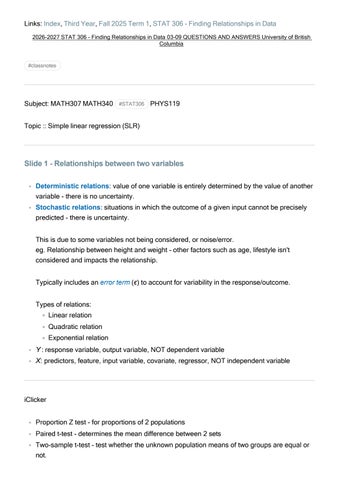 Slide 1 - Relationships between two variables Deterministic relations: value of one variable is entirely determined by the value of another variable - there is no uncertainty. Stochastic relations: situations in which the outcome of a given input cannot be precisely predicted - there is uncertainty. This is due to some variables not being considered, or noise/error. eg. Relationship between height and weight - other factors such as age, lifestyle isn't considered and impacts the relationship. Typically includes an error term (ϵ) to account for variability in the response/outcome. Types of relations: Linear relation Quadratic relation Exponential relation