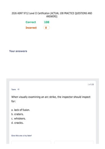 2026 ASNT 9712 Level II Certification (ACTUAL 108 PRACTICE QUESTIONS AND ANSWERS) Correct Incorrect