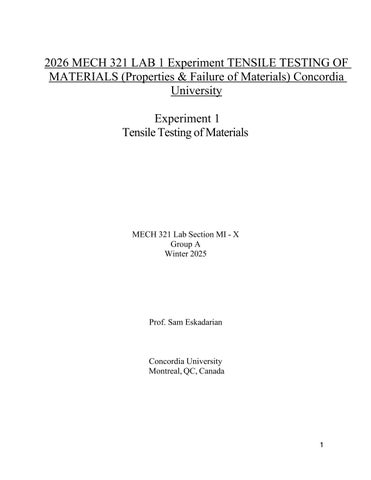 2026 MECH 321 LAB 1 Experiment TENSILE TESTING OF MATERIALS (Properties & Failure of Materials) Concordia University Experiment 1 Tensile Testing of Materials