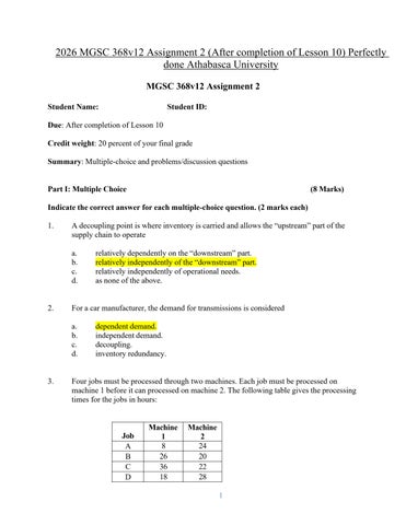 2026 MGSC 368v12 Assignment 2 (After completion of Lesson 10) Perfectly done Athabasca University MGSC 368v12 Assignment 2 Student Name: