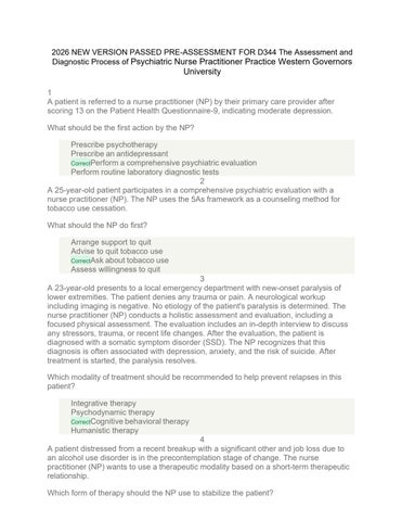 2026 NEW VERSION PASSED PRE-ASSESSMENT FOR D344 The Assessment and Diagnostic Process of Psychiatric Nurse Practitioner Practice Western Governors