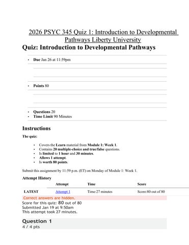 2026 PSYC 345 Quiz 1: Introduction to Developmental Pathways Liberty University Quiz: Introduction to Developmental Pathways •