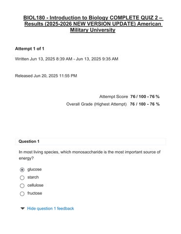 BIOL180 - Introduction to Biology COMPLETE QUIZ 2 – Results (2025-2026 NEW VERSION UPDATE) American Military University