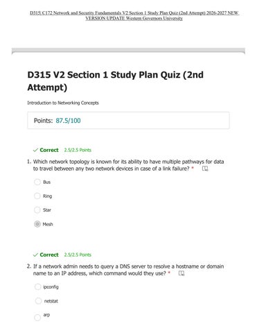 D315| C172 Network and Security Fundamentals V2 Section 1 Study Plan Quiz (2nd Attempt) 2026-2027 NEW VERSION UPDATE Western Governors University