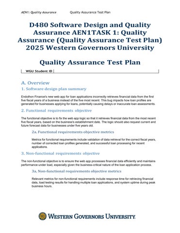 D480 Software Design and Quality Assurance AEN1TASK 1: Quality Assurance (Quality Assurance Test Plan) 2025 Western Governors University Quality Assurance Test Plan A. Overview 1. Software design plan summary Endothon Finance's new web app for loan applications incorrectly retrieves financial data from the first five fiscal years of a business instead of the five most recent. This bug impacts how loan profiles are generated for businesses applying for loans, potentially causing delays or inaccurate loan assessments.