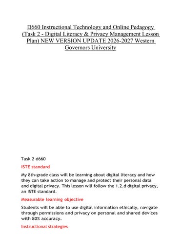 D660 Instructional Technology and Online Pedagogy (Task 2 - Digital Literacy & Privacy Management Lesson Plan) NEW VERSION UPDATE 2026-2027 Western Governors University