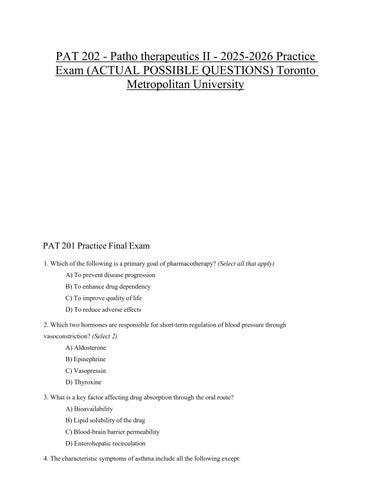 PAT 201 Practice Final Exam 1. Which of the following is a primary goal of pharmacotherapy? (Select all that apply) A) To prevent disease progression B) To enhance drug dependency C) To improve quality of life D) To reduce adverse effects 2. Which two hormones are responsible for short-term regulation of blood pressure through vasoconstriction? (Select 2) A) Aldosterone B) Epinephrine C) Vasopressin D) Thyroxine 3. What is a key factor affecting drug absorption through the oral route? A) Bioavailability B) Lipid solubility of the drug C) Blood-brain barrier permeability D) Enterohepatic recirculation 4. The characteristic symptoms of asthma include all the following except: