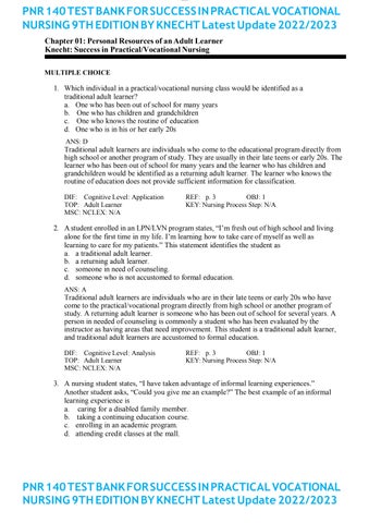 PNR 140 TEST BANK FOR SUCCESS IN PRACTICAL VOCATIONAL NURSING 9TH EDITION BY KNECHT Latest Update 2022/2023 Chapter 01: Personal Resources of an Adult Learner Knecht: Success in Practical/Vocational Nursing MULTIPLE CHOICE