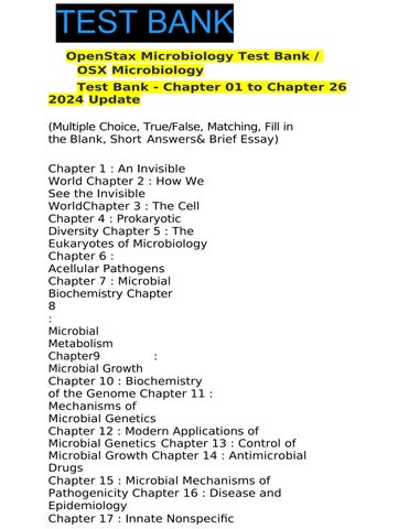 TEST BANK OpenStax Microbiology Test Bank / OSX Microbiology Test Bank - Chapter 01 to Chapter 26 2024 Update (Multiple Choice, True/False, Matching, Fill in the Blank, Short Answers& Brief Essay) Chapter 1 : An Invisible World Chapter 2 : How We See the Invisible WorldChapter 3 : The Cell Chapter 4 : Prokaryotic Diversity Chapter 5 : The Eukaryotes of Microbiology Chapter 6 : Acellular Pathogens Chapter 7 : Microbial Biochemistry Chapter 8 : Microbial Metabolism Chapter9 : Microbial Growth Chapter 10 : Biochemistry of the Genome Chapter 11 : Mechanisms of Microbial Genetics Chapter 12 : Modern Applications of Microbial Genetics Chapter 13 : Control of Microbial Growth Chapter 14 : Antimicrobial Drugs Chapter 15 : Microbial Mechanisms of Pathogenicity Chapter 16 : Disease and Epidemiology Chapter 17 : Innate Nonspecific