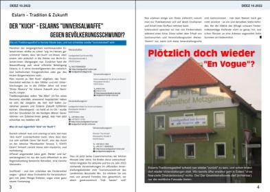 Leserinnen, Liebe Leser, schön, dass Sie wieder hier sind! Nun hat es doch wieder einmal länger gedauert Ihnen diese Oktober Ausgabe zu präsentieren In der Marktgemeinde Eslarn hat sich seit der letzten Ausgabe nicht allzu viel getan Natürlich ging das Vereinsleben weiter voran, aber die Wirtschaft im Ort ist wie seit über 20 Jahren nicht relevanter geworden Zugegeben es gibt immer noch vier Metzgereien/ Metzgereiverkaufsstellen, und auch drei Bäckerei en/ Bäckereiverkaufsstellen sind noch vorhanden Eine Apotheke gibt es bekanntermassen seit 2011 nicht mehr, einen Zahnarzt und einen stationären Friseur nur mit Terminvereinbarung. Dabei wollte man nur um es wieder einmal zu erwähnen ; ) seit 2011 den Ortskern beleben