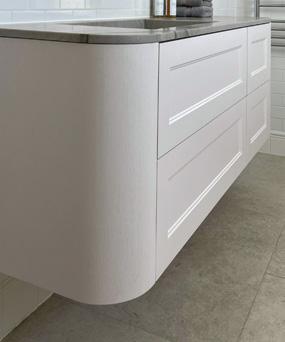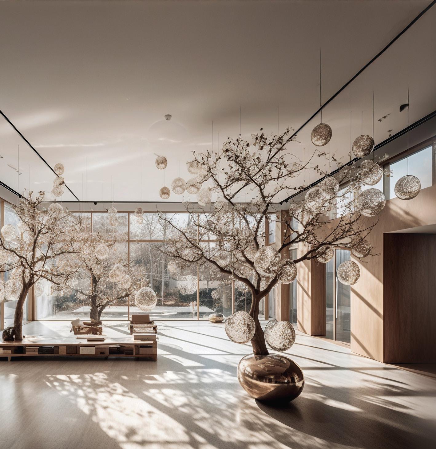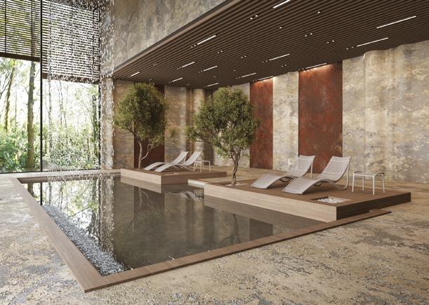 cingi, dažnas suapvalintų formų, jie ramina erdvę, užuot joje dominavę. Interjeras čia vizualiai susilieja su kraštovaizdžiu. Ypač daug dėmesio skirta perėjimams – iš vidaus į išorę, iš viešų zonų į privačias. Baseino erdvė suprojektuota kaip esminė interjero ir kraštovaizdžio jungtis – ne kaip atskiras objektas, o kaip architektūrinis potyris, kuris tęsiasi iš vidaus į išorę. Čia vanduo tampa medžiaga, o baseinas – ramybės, šviesos ir erdvės valdymo įrankiu. Linijos švarios ir tikslios, nukreiptos į hori-