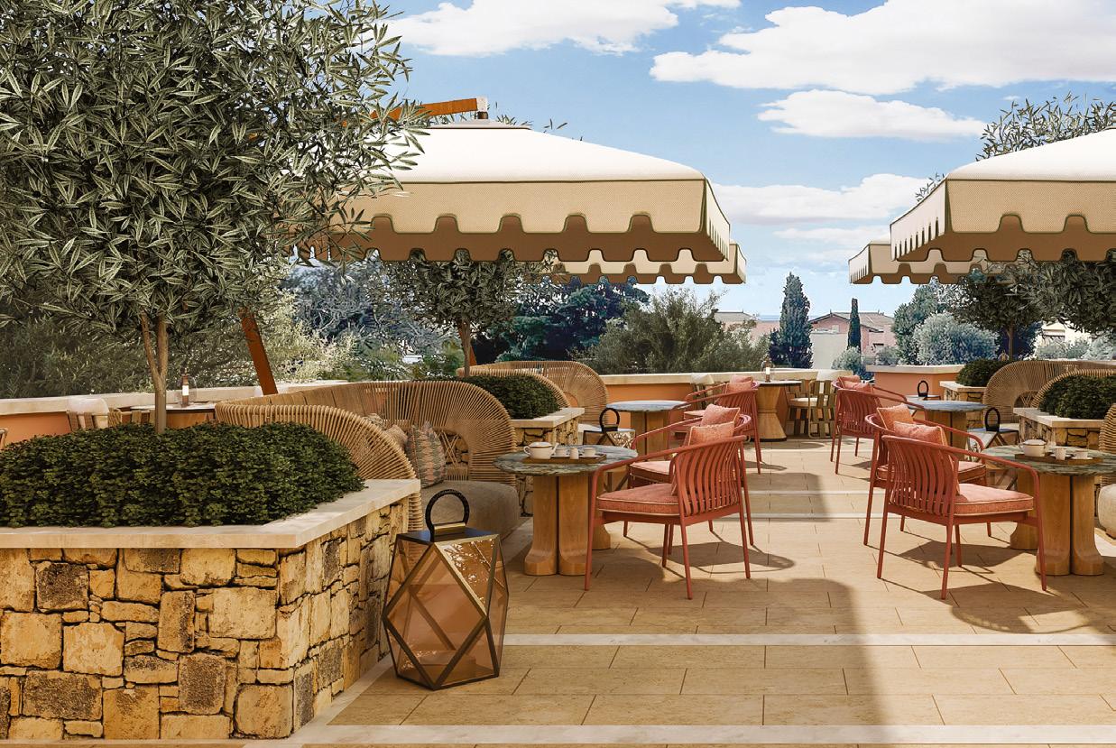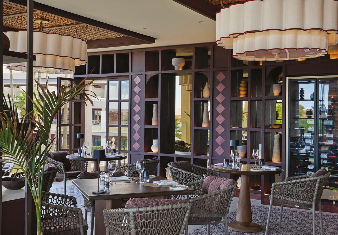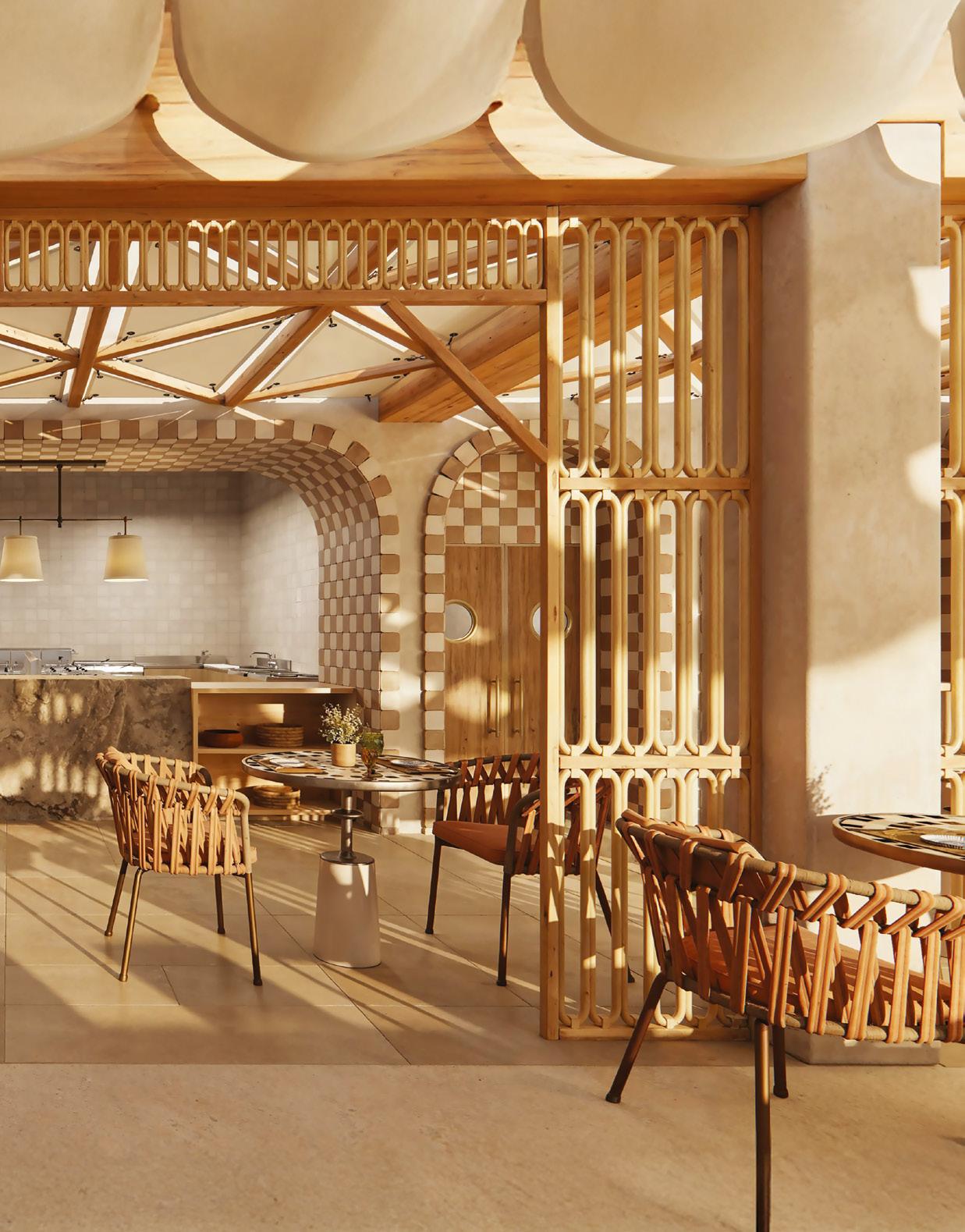 niai elementai ir augmenija naudojami ne dekoratyviai, o funkcionaliai: jie filtruoja šviesą, reguliuoja temperatūrą ir kuria minkštą šešėlį, kuris tampa esmine komforto dalimi. Sėdėjimo zonos išdėstytos mažomis grupelėmis, net bendrosiose erdvėse išlaikomas privatumo pojūtis. Naudojamos medžiagos atsparios karščiui ir intensyviam naudojimui, bet kartu vizualiai