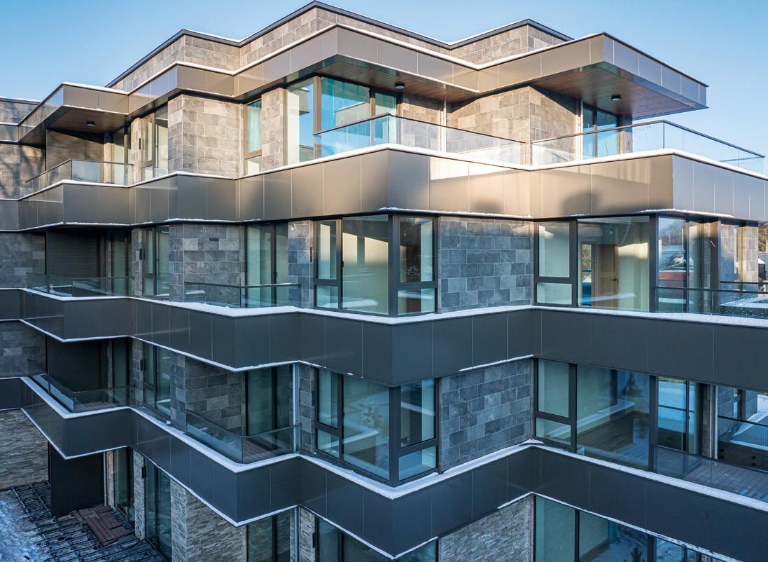 Kiekvienas daugiaaukštis suprojektuotas taip, tarsi būtų sudarytas iš trijų skirtingų dalių, kurių kiekvienoje atsiveria skirtingi vaizdai, susiję su skirtingu kontekstu – gatve, miestu ar dangumi. Vertikalių plokštumų akcentas –horizontali turkio spalvos bendrųjų erdvių juosta per septintąjį aukštą. Daliai komplekso pasirinkta neapdoroto betono tekstūra, raudona