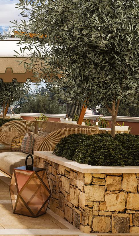 paviršiai, šilti, žemiški tonai. Spalvos nekonkuruoja su augalais – priešingai, juos išryškina ir taip kuria ramų, beveik meditacinį foną. Baldai žemi, proporcingi, be dekoratyvinių elementų pertekliaus: užuot dominavę, jie palaiko erdvės ritmą. Įgilinti sodai veikia ir kaip mikroklimato reguliatorius. Jie vėsina erdves karštomis dienomis, filtruoja šviesą ir kuria minkštą šešėlį. Parinkta vietos augmenija neatrodo dekoratyvinė, ji natūraliai įsilieja į aplinką. Laikui bėgant sodai keisis, tankės, augs, o kartu keisis ir pačios erdvės charakteris. Šiame projekte architektai sąmoningai leido laikui tapti dizaino dalimi. Galutinis rezultatas – svetingumo erdvė, kurioje nėra demonstruojama prabanga. Ji juntama per tylą, šešėlį, vėsą ir natūralų ryšį su augmenija.