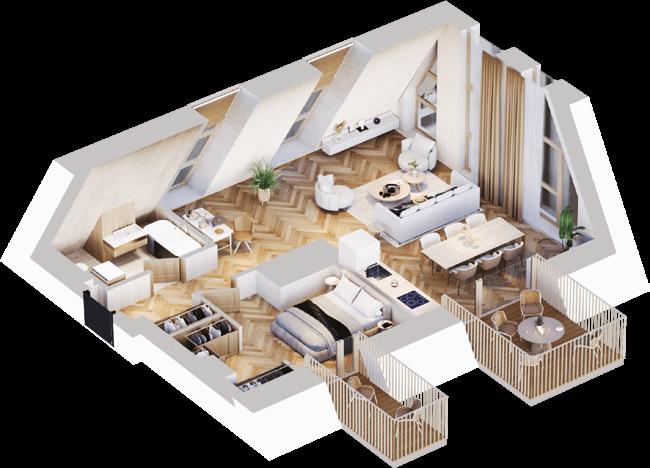 Iš 288 butų pusė skirti parduoti, kiti 34 proc. – socialiniai būstai, 16 proc. numatyta nuomoti viduriniajai klasei. Perdalijus erdves, būstų galėtų padaugėti iki 350. Viduriniuose aukštuose įrengtos visiems apartamentams bendros daugiafunkcės erdvės ir svečių kambariai. Taip pat per kelis