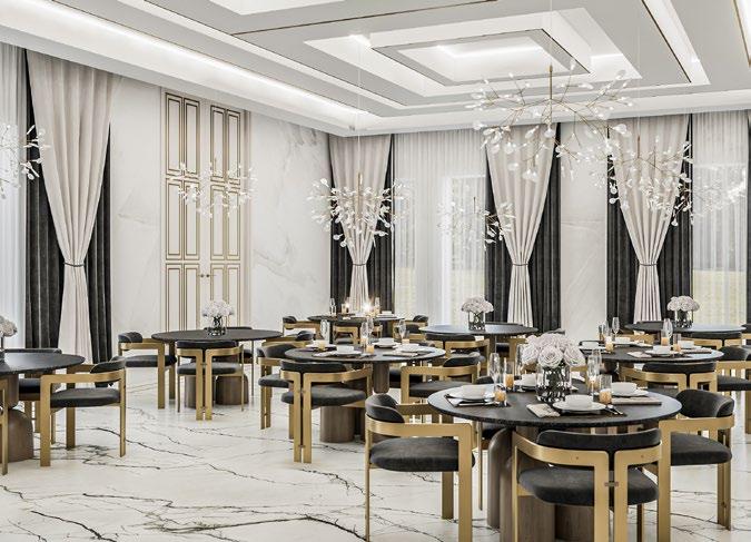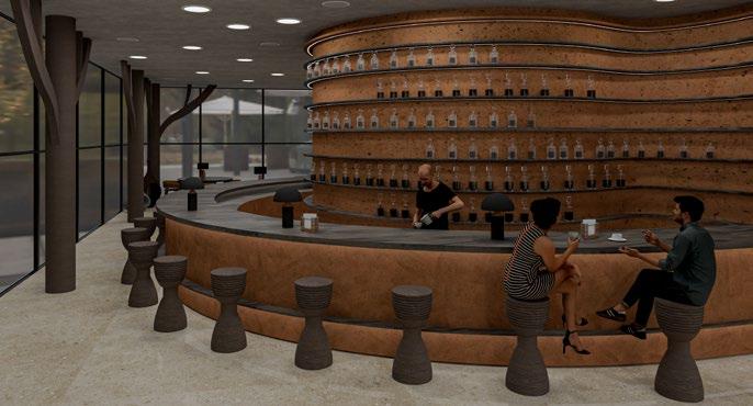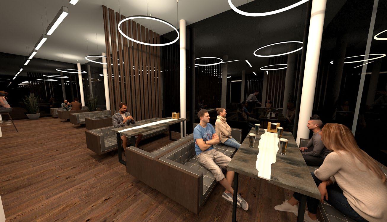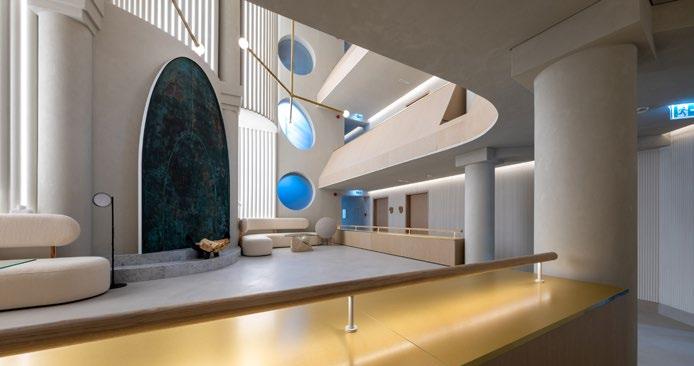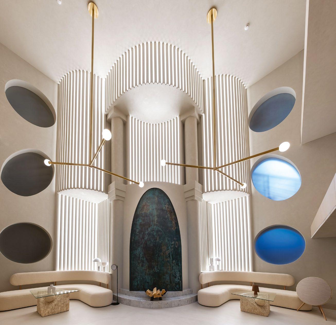 Skersinėse sienose dėmesį patraukia didelės, apskritos angos, kurios suskaido erdvę į mažesnes zonas ir suteikia svečiams daugiau privatumo.