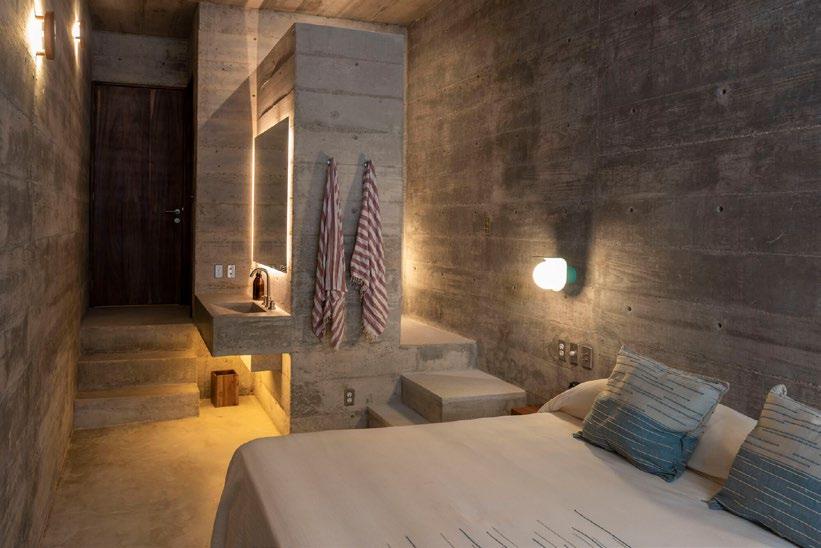 Neapdorotas betonas buvo naudojamas visame viešbutyje ir paliktas kaip atvira apdaila svečių kambariuose ir viešosiose vietose. Medžiaga taip pat buvo naudojama įmontuotiems baldams, tokiems kaip suolai, lentynos, praustuvės ir net svečių lovos.