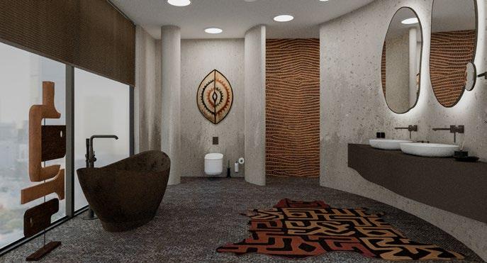 Spalvų paletę sudaro tipiški betono ir nerūdijančiojo plieno atspalviai, kuriuos papildo turkio atspalviai. Išskirtiniais akcentais tampa „Natural Urbano Studio“ lempos ir kai kurios dekoratyvinės detalės. Geltonos, mėlynos ir žalios spalvos akcentai kontrastuoja su vivenda, Alfredo Orozco rankų darbo tekstile. Interjerą sušvelnina nestandartiniai baldai, suprojektuoti vietos meistrų, spalvingi kilimėliai ir gobelenai bei gausybė vazoninių augalų.