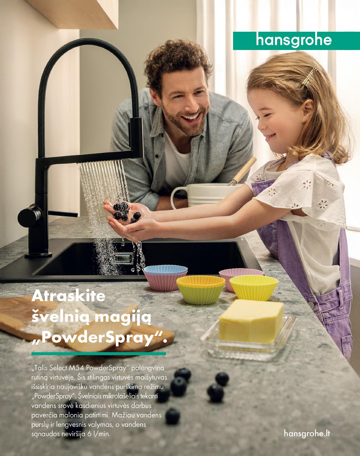 GROHE. Virtuvėje pasirinktas virtuvės maišytuvas „Grohe K7“ išsiskiria inovatyviu dizainu ir dideliu funkcionalumu. Jis užtikrina patogų naudojimą, vandens taupymą ir tvarumą, puikiai papildo išmanius namo sprendimus ir estetiškai įsilieja į erdvę.