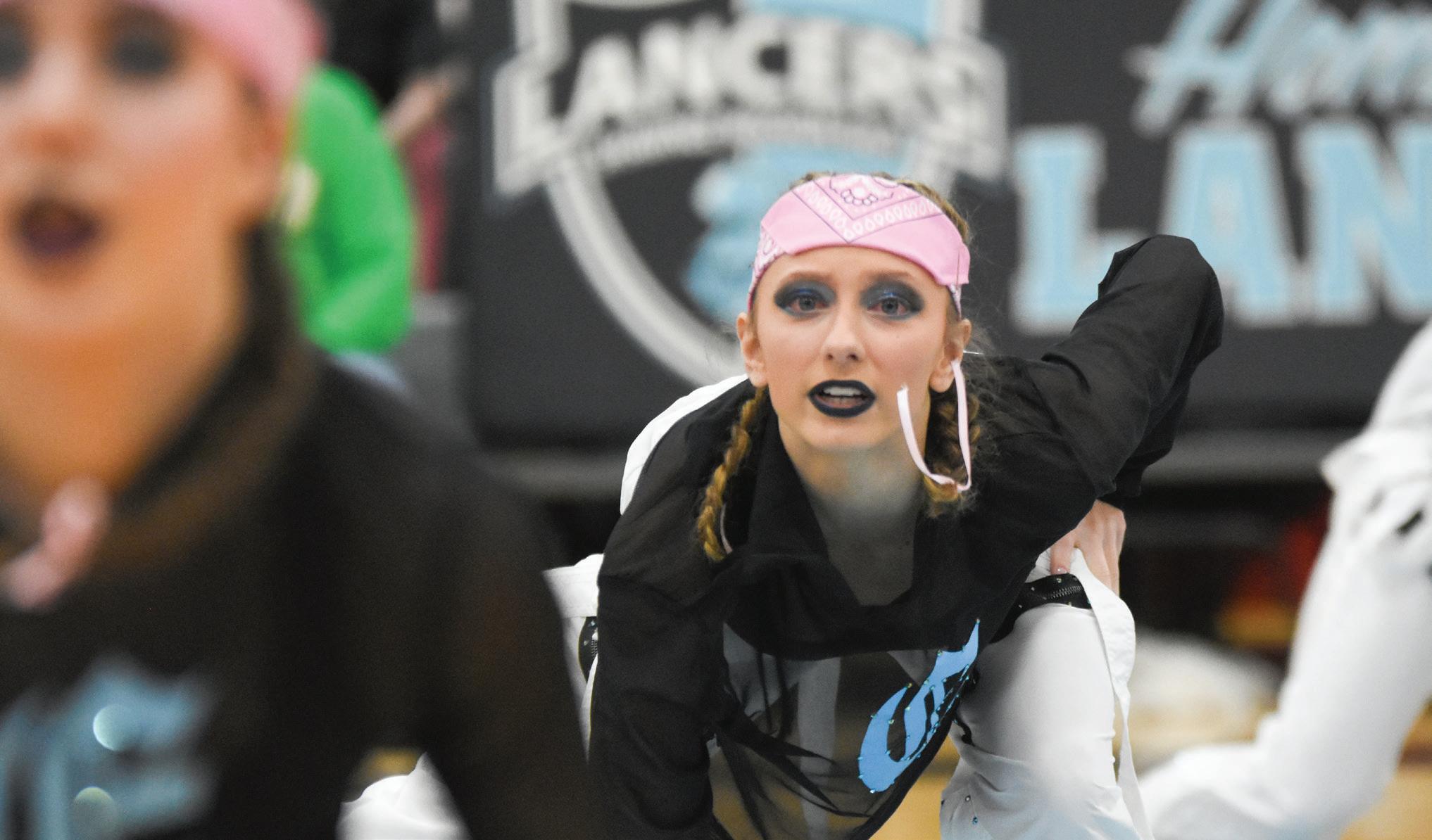 TOP RIGHT Senior Avery Guck drops in their nationals hip hop routine before a kip up. The team did their makeup and routine that they will do for nationals at the varsity boys basketball game against South on Feb. 24. photo by I kenna harrington