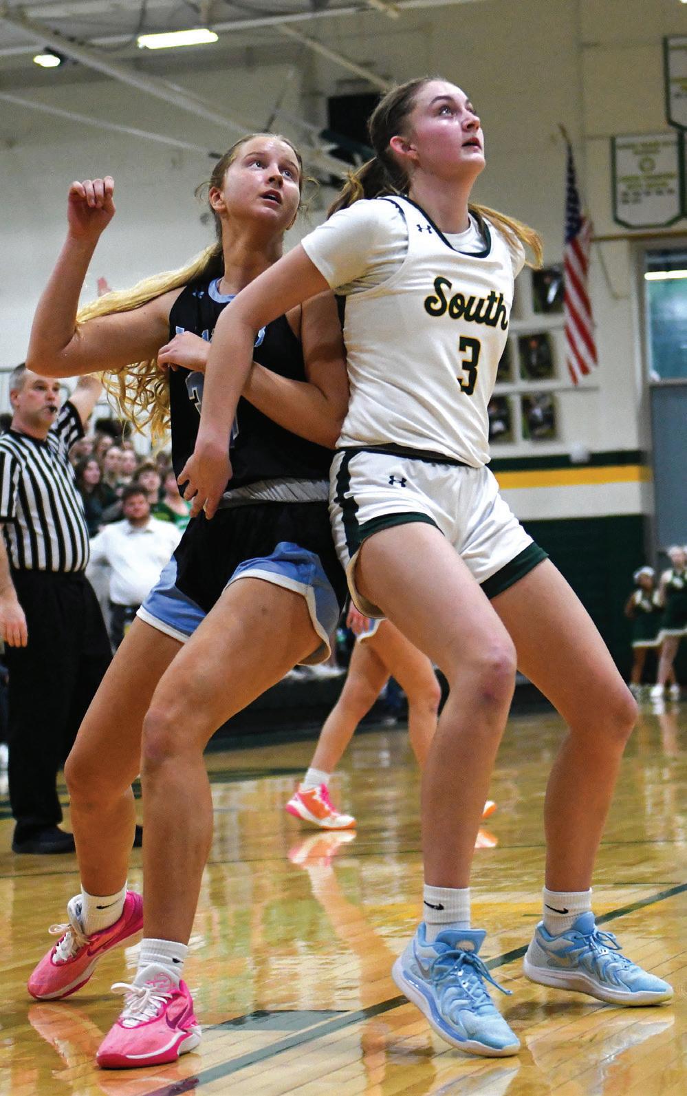 photo by emma weidman LEFT Sophomore Coco Reiser gets boxed out by an SM South player trying to get the rebound on a free throw.
