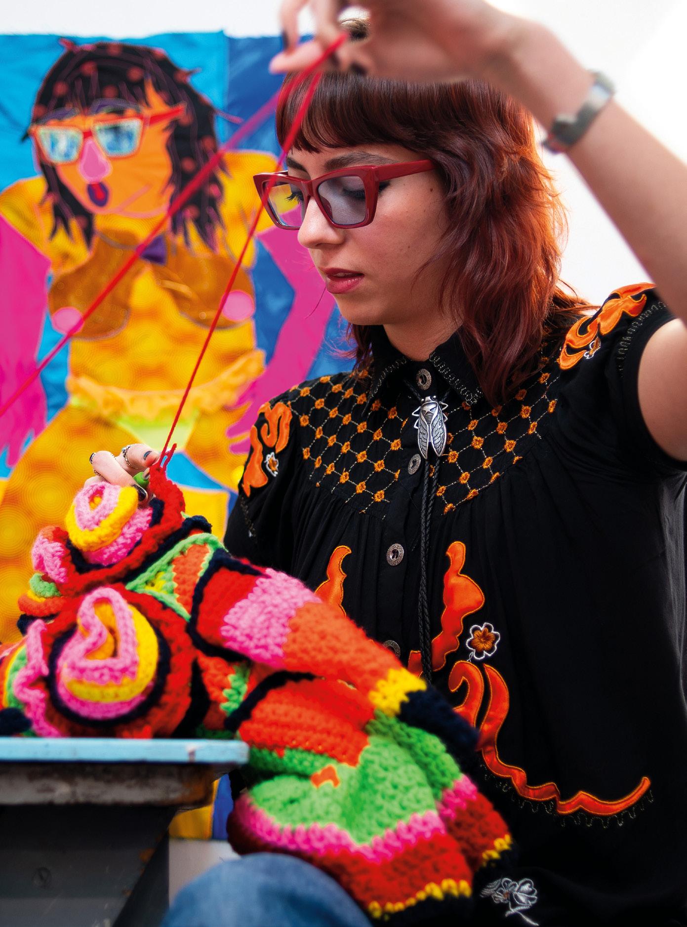 Students promote sustainable practices in campus-wide programming for the annual Health, Safety, & Sustainability Day. The 2024 celebration included lectures and workshops about indigenous jewelry materials with Aquinnah Wampanoag visiting artist Elizabeth James-Perry, using ceramics to restore coral reefs with Professor Jennie Jieun Lee and ROBBIE MOSER-SAITO, BFA+BA ’25, creating a crochet installation with the Fiber Arts Club, and making DIY 3D printing machines that recycle plastic with YAQI CAI, BFA ’25.