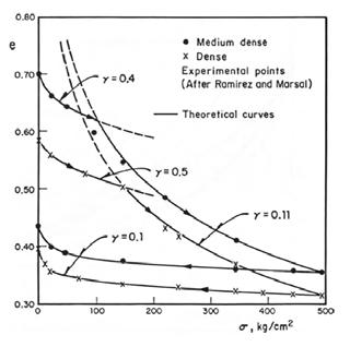 2. The coefficient of compressibility, in loading, in the unvirgin curves γu is a function of the size, form and relative density of the solid particles as well as on the cycle number and cycle amplitude in cyclic testing.