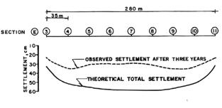 1. It can be concluded that the test embankment constitutes an interesting contribution, because on the one hand, has made it possible to compare the magnitudes of the total settlements calculated with the actual values to be developed in the field, and on the other hand, provides an opportunity to verify the applicability of equation 2 as a procedure to predict the evolution of settlements in subsurface conditions similar to those existing under the ancient Texcoco Lake, where secondary consolidation plays an important role.