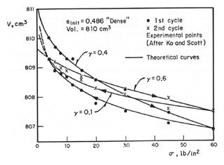 From eq. (20) it can also be seen that σ* is directly proportional to σp, in swelling from the virgin curves. These permit to predict swelling curves from any point on the virgin curves. The results on Ottawa sand contained in Table 1, already described, point to suggest that γus = 0.1 is constant not only for unloadings from points on the virgin curves but also to unloadings from points on the unvirgin loading curves. A very nice result if it is true. Is it?