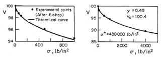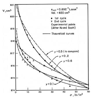 3. For granular material the coefficient of compressibility γ in the virgin curves and the coefficient of expansion γus (which appears to be equal to γ) appear to depend only on the strength and deformation characteristics of the solid particles of the soil and to be independent of size, form, and relative density. In expansion curves from the virgin curves, the characteristic pressure σ* is proportional to the starting pressure σp, eq. (20), and the value of Vo is proportional to the starting volume Vp, eq. (18).