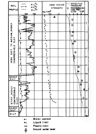 Figure 4 shows in detail the stratigraphy found at the site from a representative borehole, where it can be observed that the total thickness of the compressible strata reaches a magnitude of 52 m, out of which 36 m correspond to the so-called upper clay formation with a mean water content close to 300 hundred per cent, and the remaining length covers what is known as the lower clay formation, where the average water content decreases to a value of approximately 200 percent. The compressible deposits are underlaid by deep hard strata of sandy silt and silt.