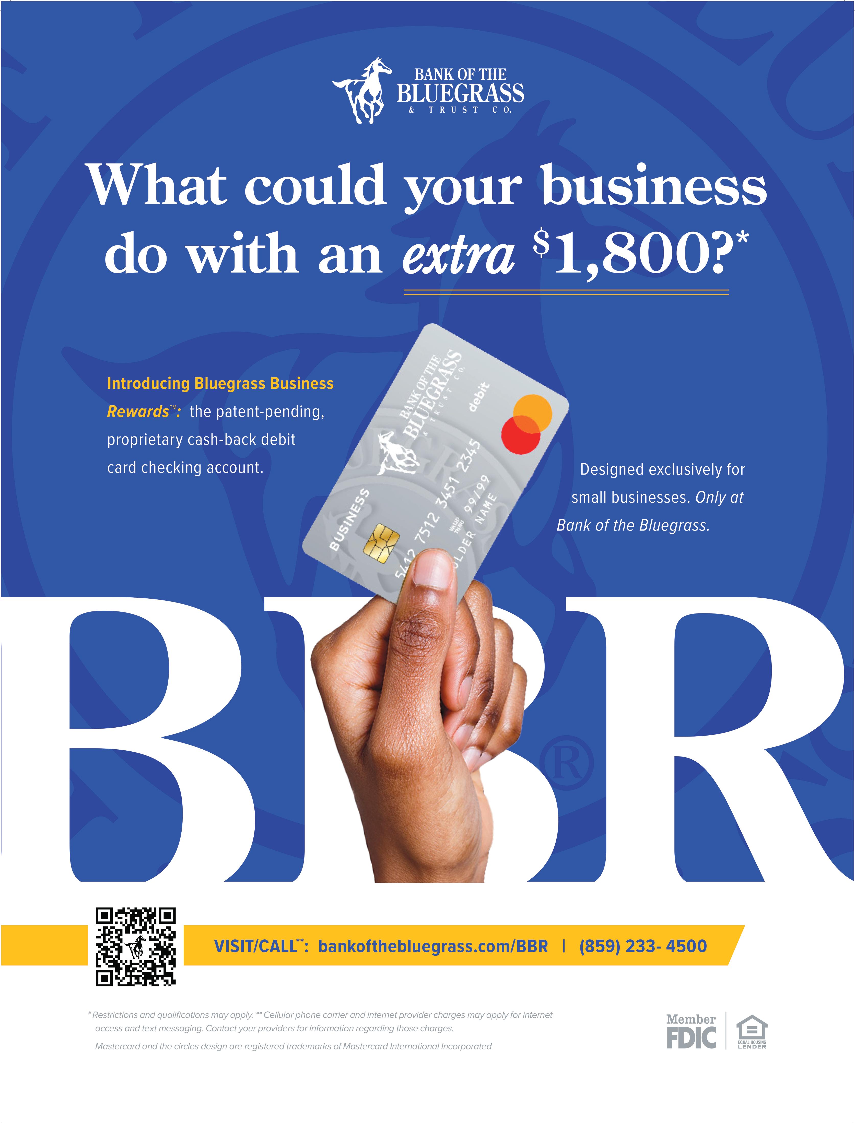 Last fall, we announced the launch of a proprietary product designed exclusively for the dynamic needs of small businesses in our community: Bluegrass Business Rewards. This innovative o ering, a cash-back checking account, is a testament to our dedication to fostering local entrepreneurship and helping growing companies thrive. We understand that small businesses are the heartbeat of Lexington and Central Kentucky, and this new product is our way of providing tailored financial solutions to fuel their success.