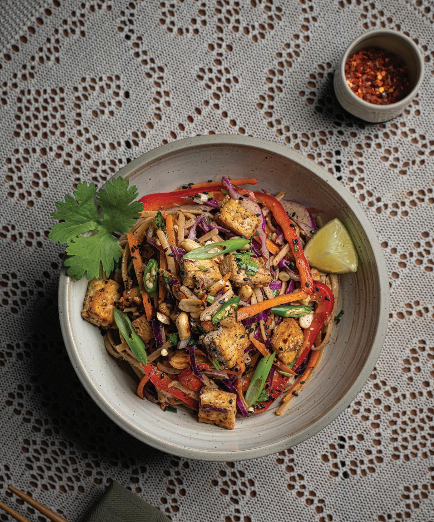 6. Assemble the Salad. Add the cooled linguine pasta to the bowl of salad. Gently fold all ingredients together with your hand or two wooden spoons. Add the tofu cubes and toasted peanuts, then fold again to combine. Transfer the salad to a serving bowl and garnish with the reserved toasted black sesame seeds, chopped green onion, and a squeeze of fresh lime juice. Enjoy!