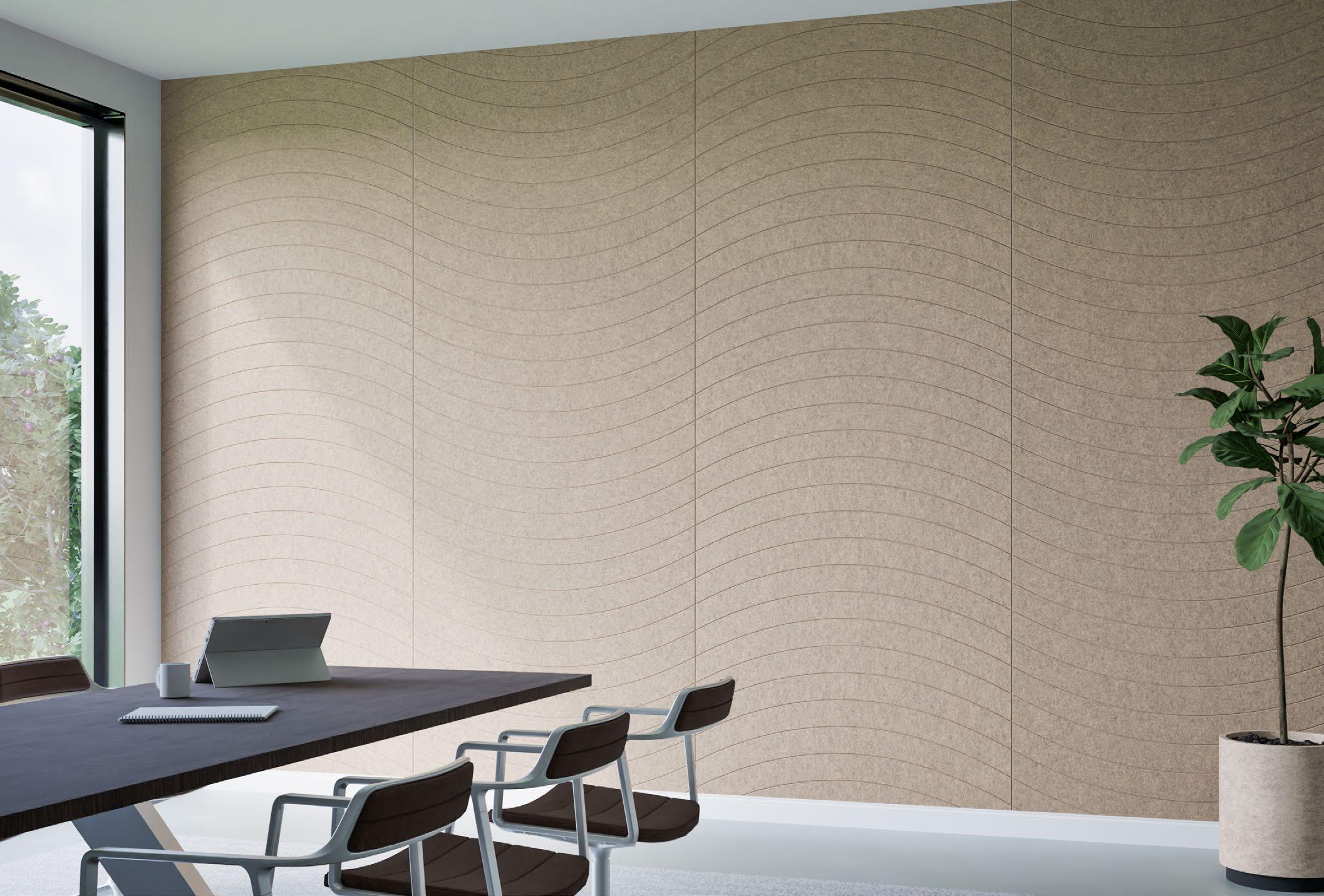 • Un panneau acoustique en feutre PET avec un choix parmi 21 couleurs (voir page 33) et éventuellement une impression personnalisée (uniquement sur White - P001) ou le motif en V-cut DP01 en option.