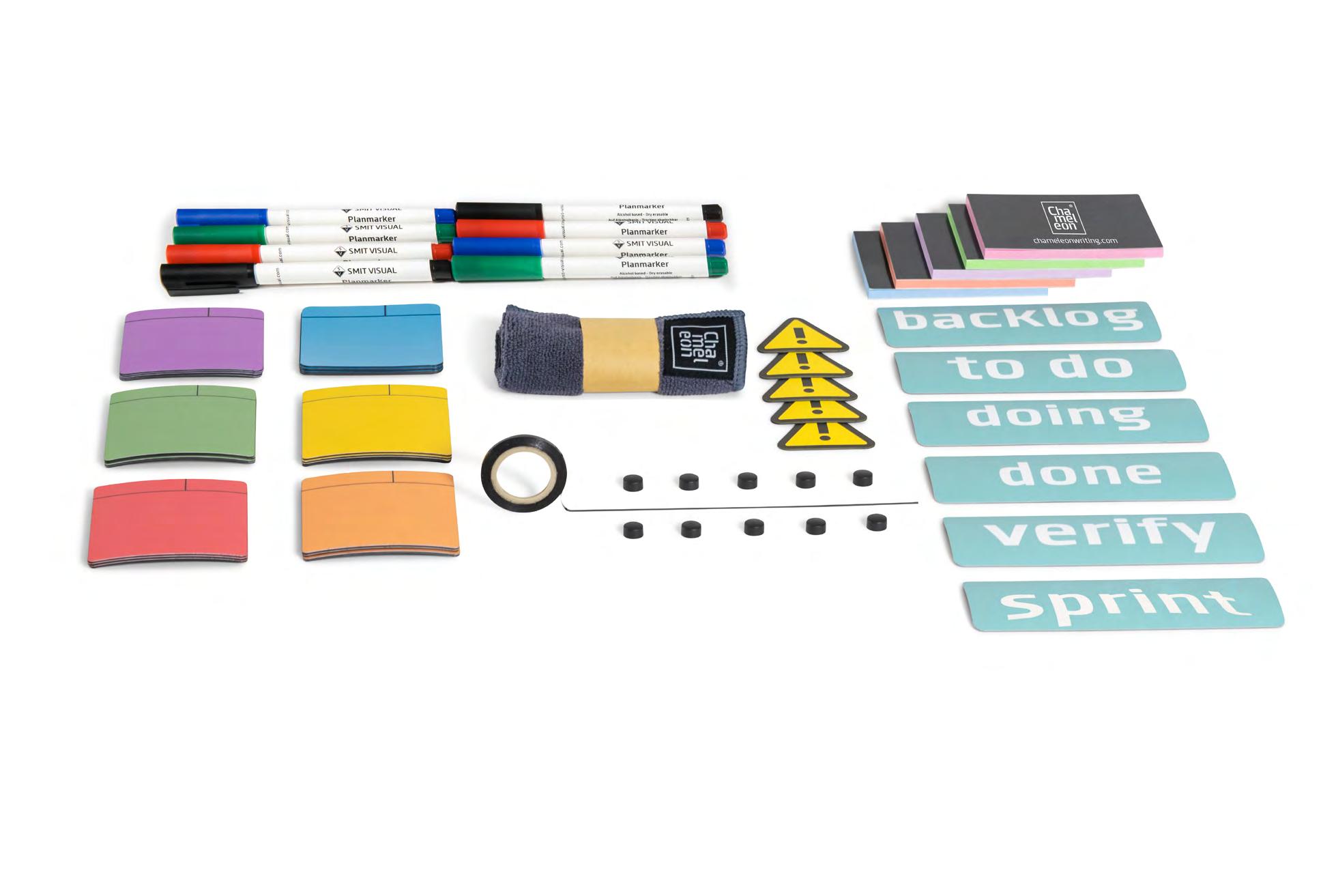Boite à outils avec tous les éléments essentiels pour immédiatement commencer le scrum. Composé en collaboration avec des spécialistes de la méthode Agile. Ce Scrumkit n’est pas adapté aux tableaux en verre.