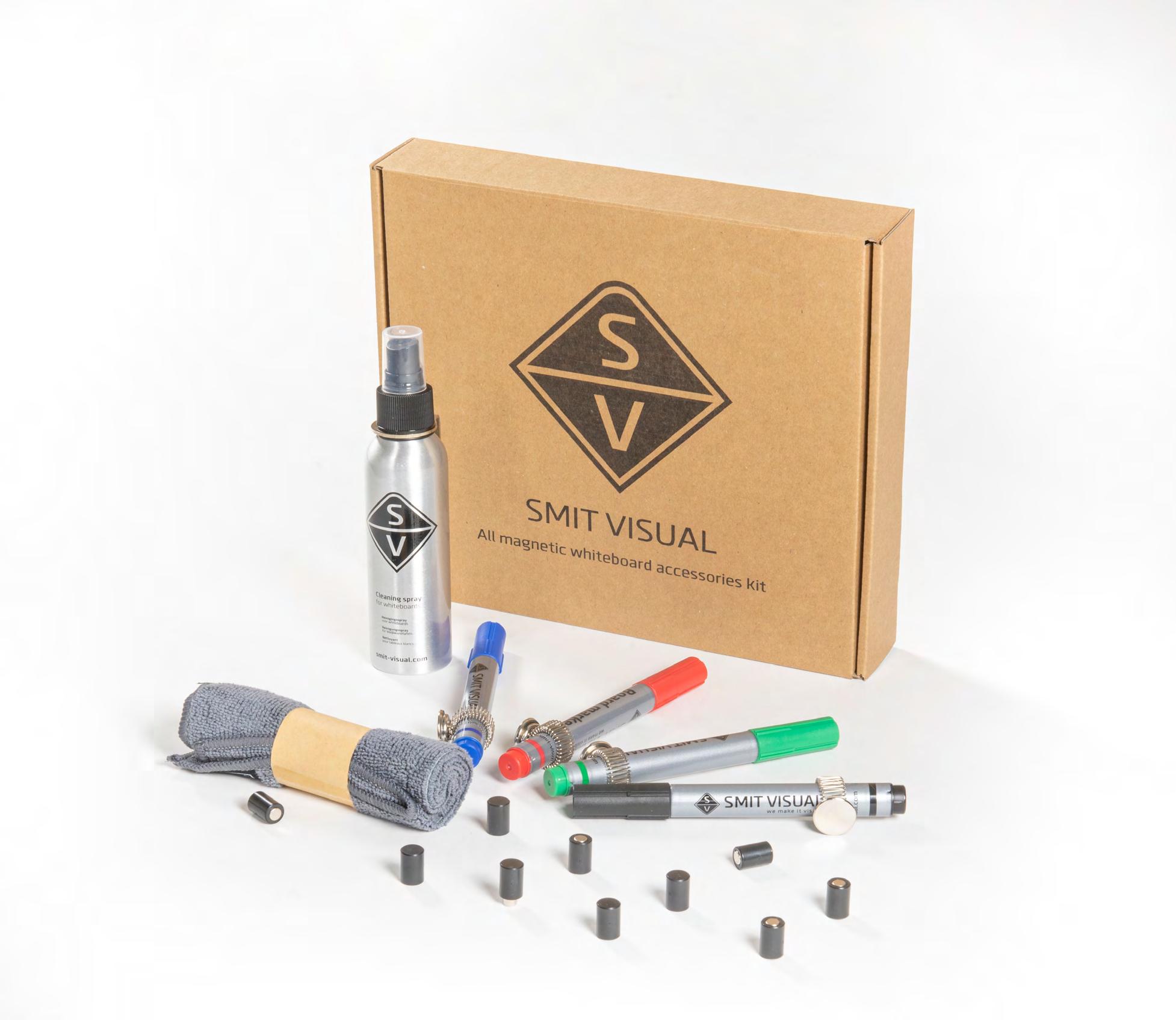 Chaque élément du Starterkit Deluxe est magnétique. Les marqueurs, sprays effaceurs et chiffons en microfibre peuvent ainsi être accrochés partout sur le tableau blanc*. Pour les tableaux blancs sans cadre (Sharp, Curve), Chameleon propose en alternative un support design transparent pour les marqueurs. Celui-ci peut être fixé en bas du tableau à l’aide d’une bande adhésive (ce produit n’est pas magnétique).