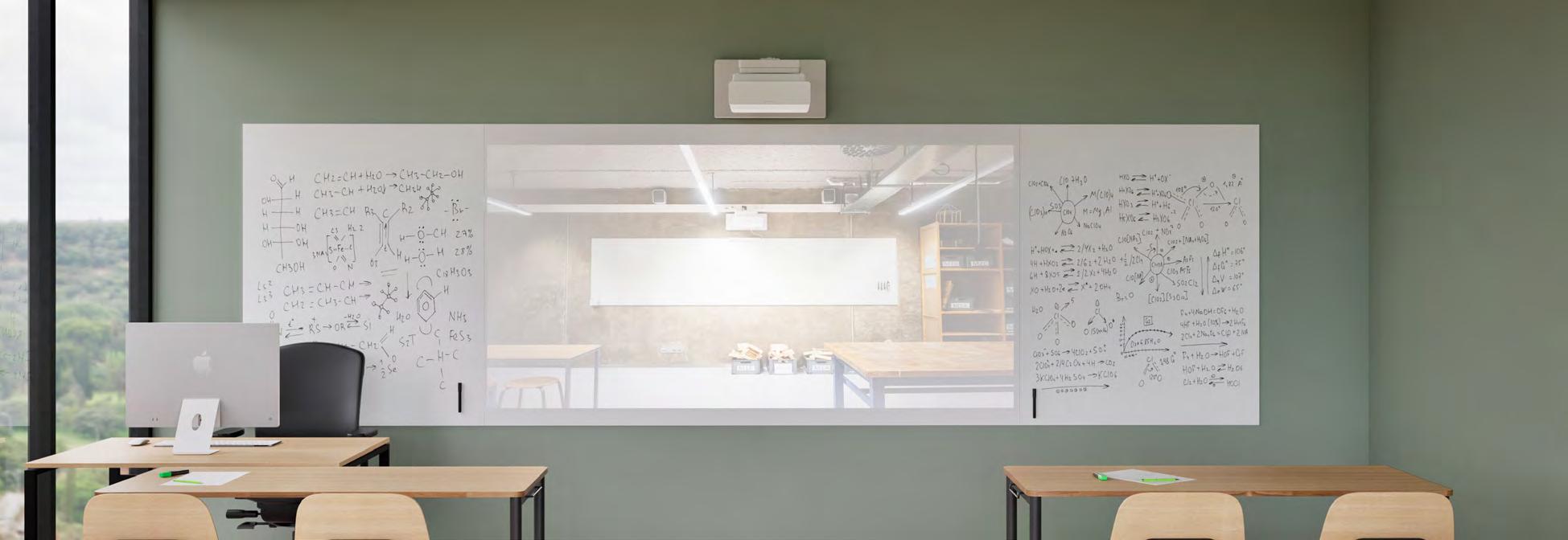Cette surface extrêmement mate ne produit aucune réflexion. La projection sur ce tableau offre ainsi la meilleure qualité d’image possible pour les projecteurs. Le tableau est inscriptible, mais moins facile à effacer que d’autres surfaces. Lors de l’effacement avec un spray pour tableau blanc, le tableau peut être nettoyé correctement.