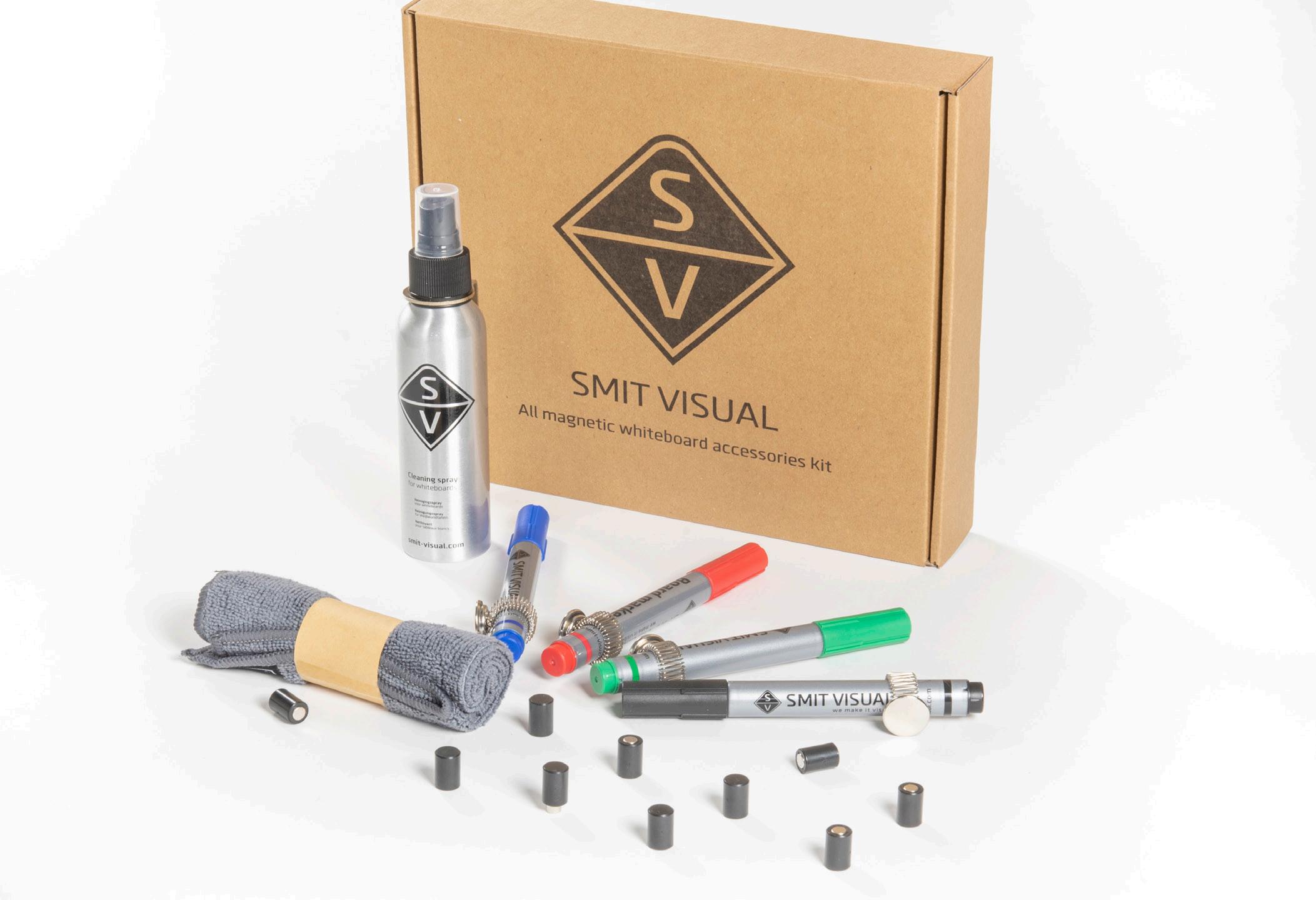 Deze starterkit bevat bordmagneten die geschikt zijn voor glasborden. Ook de magnetische wisserdoek heeft een ingenaaide glasbordmagneet. De stiften en wisserspray zijn niet magnetisch. Daarvoor is in de starterkit een transparante afleg opgenomen.