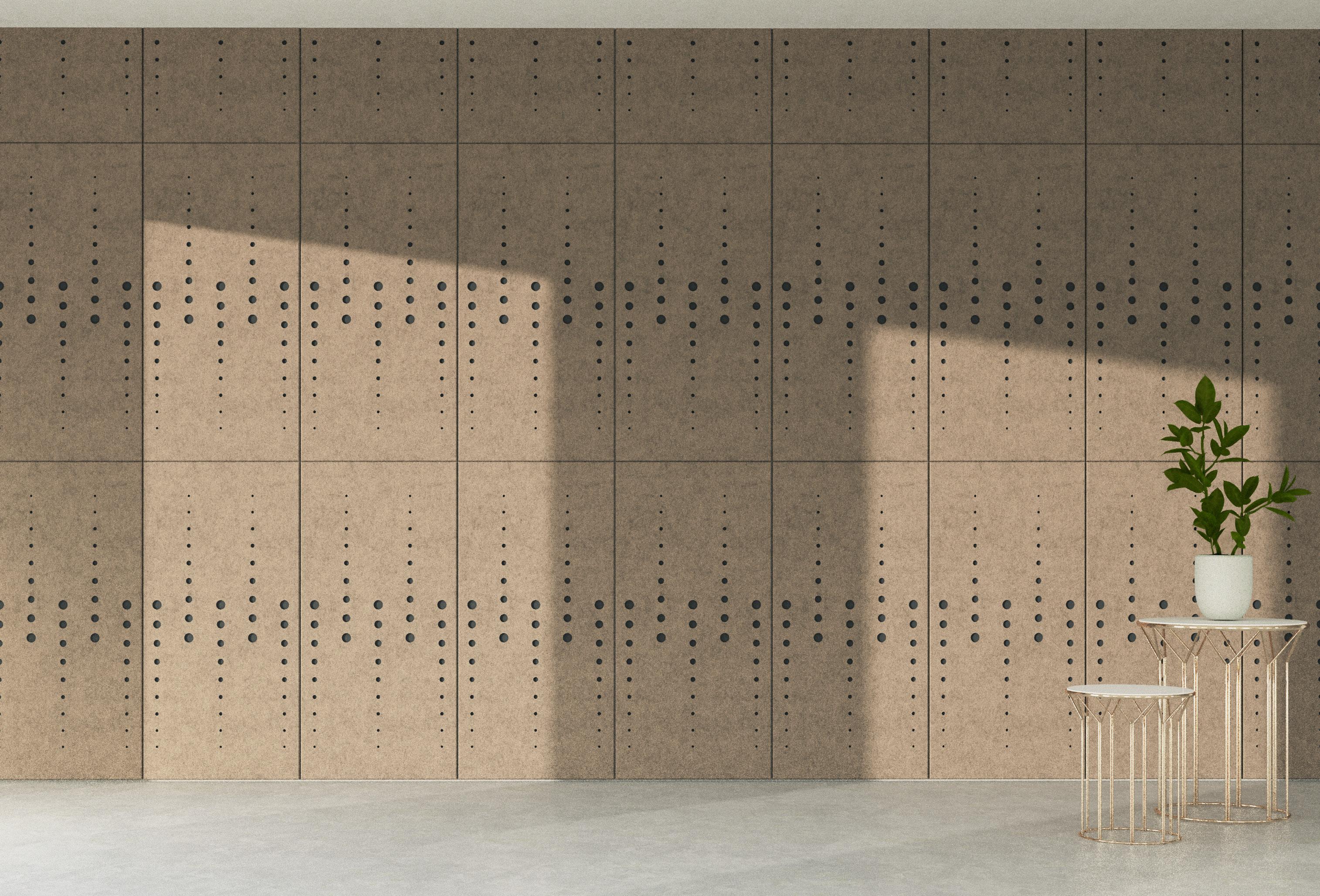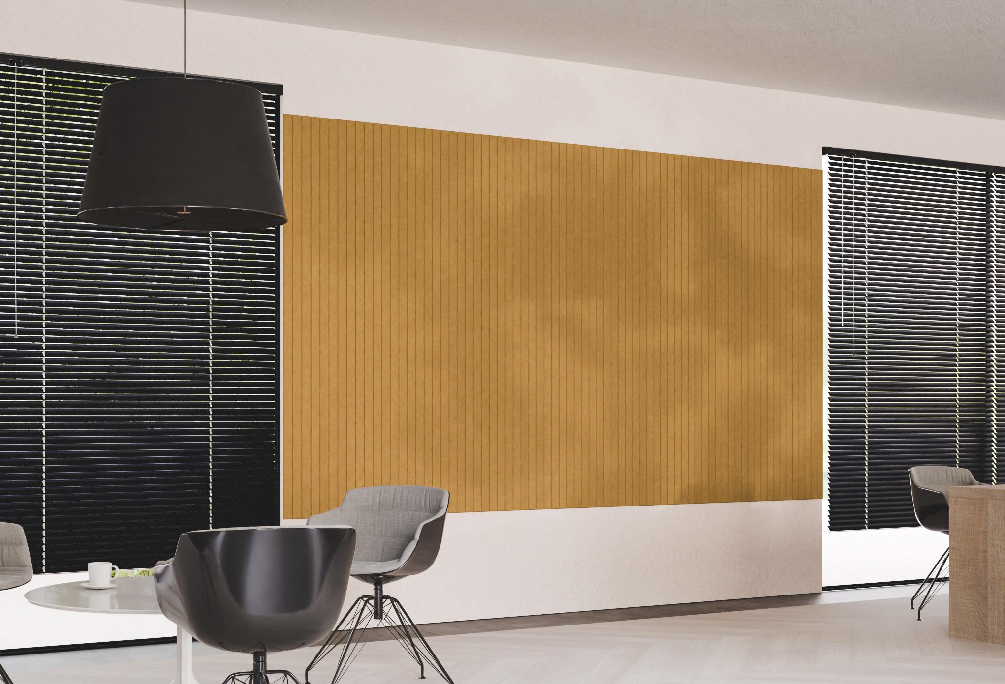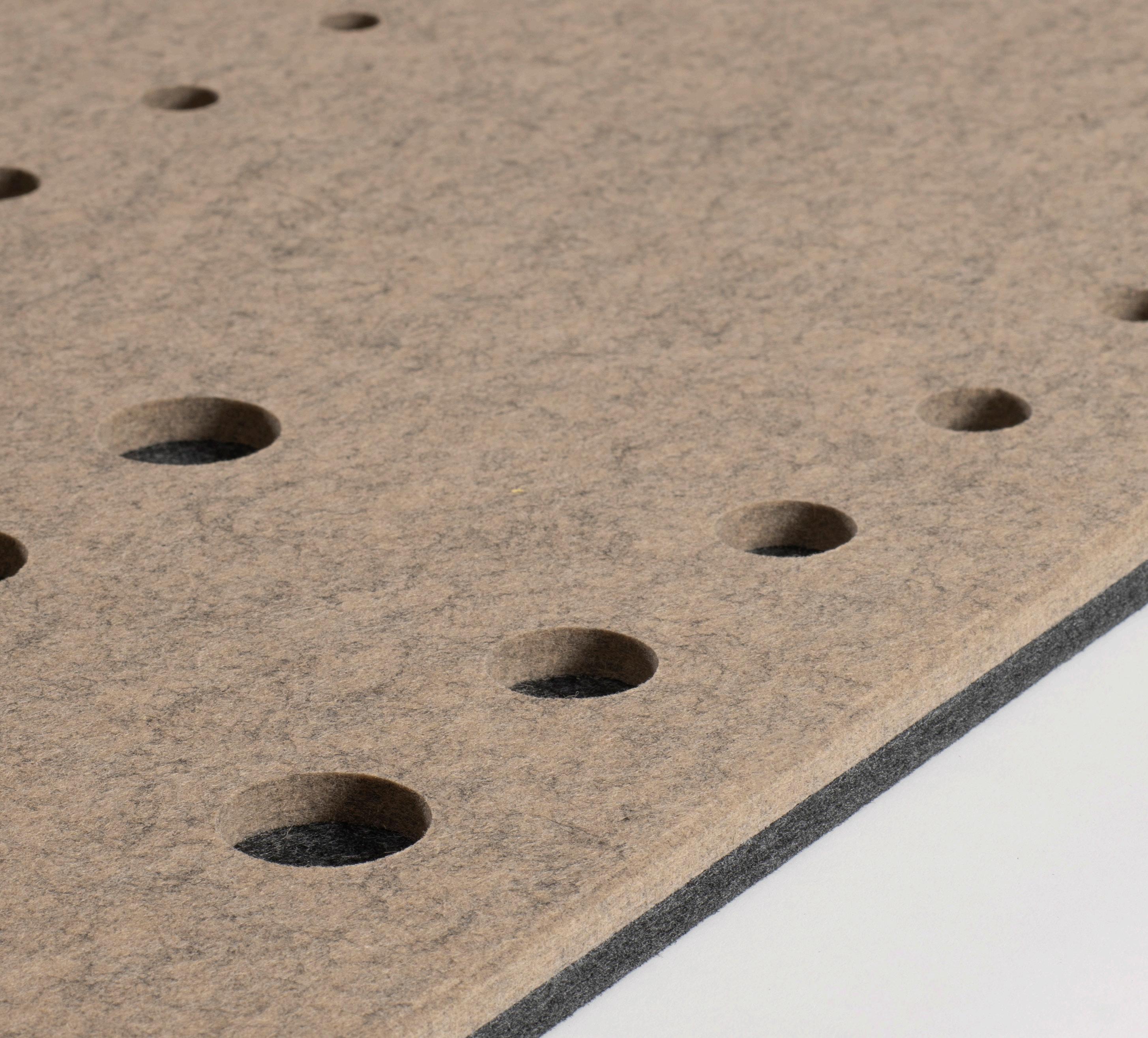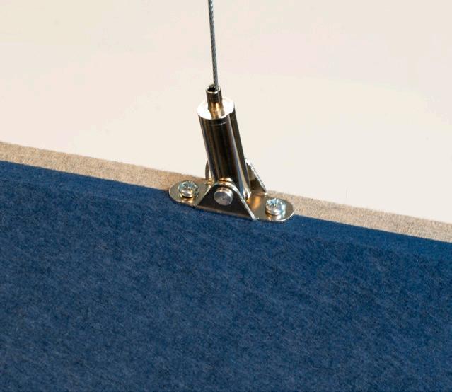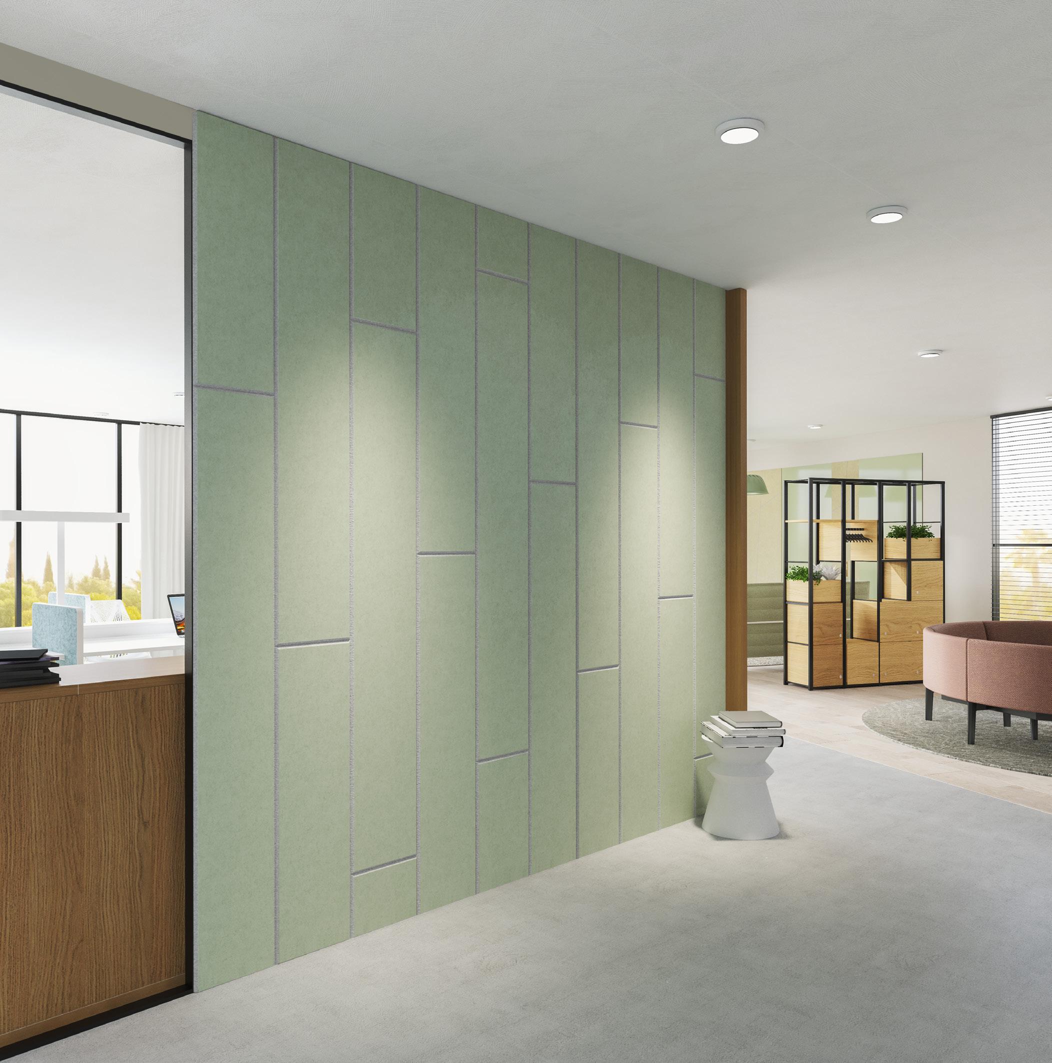 • Een PET-vilt akoestisch paneel met keuze uit 21 kleuren (zie p. 31) en optioneel een bedrukking (enkel op White - P001) of het V-cut patroon DP01.