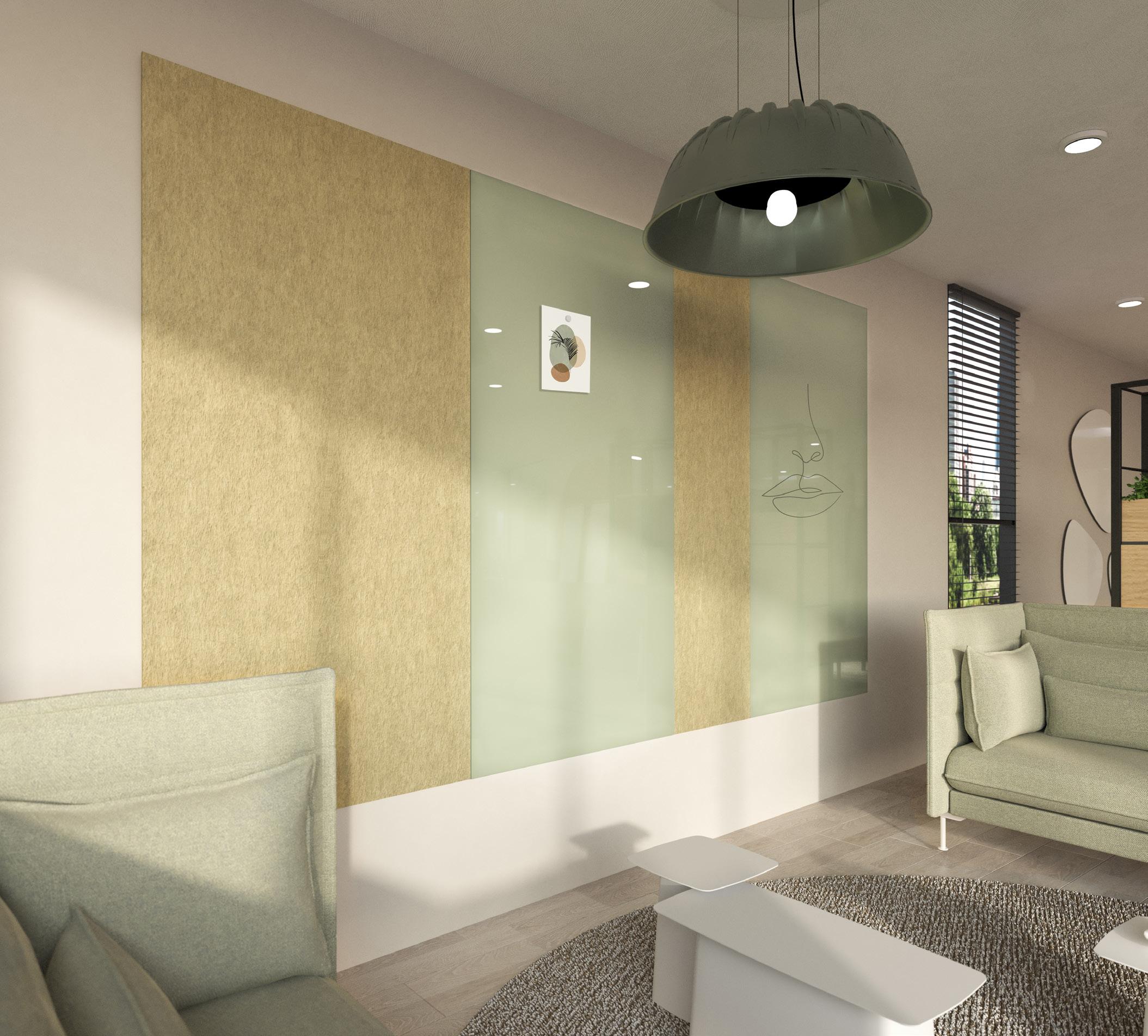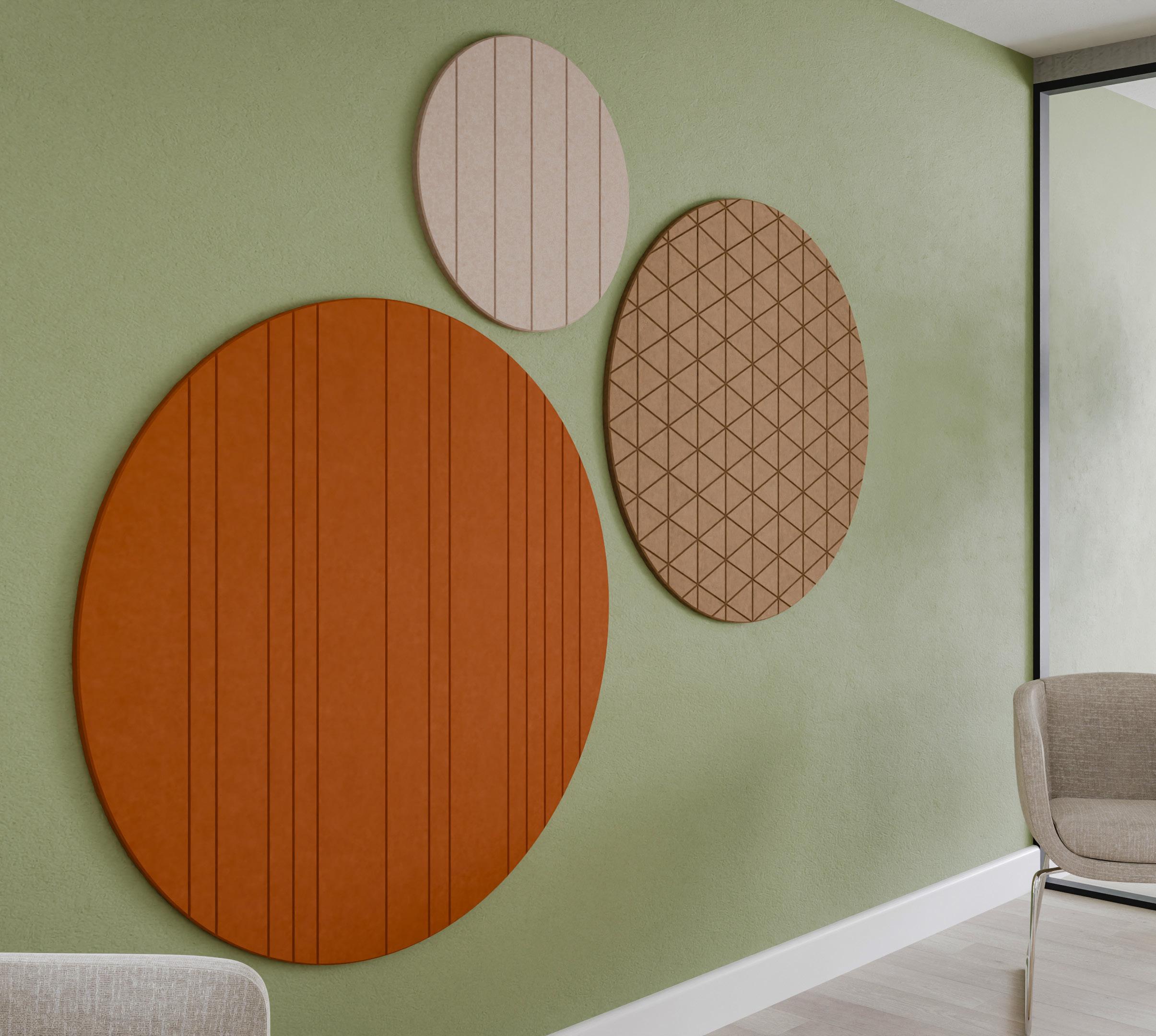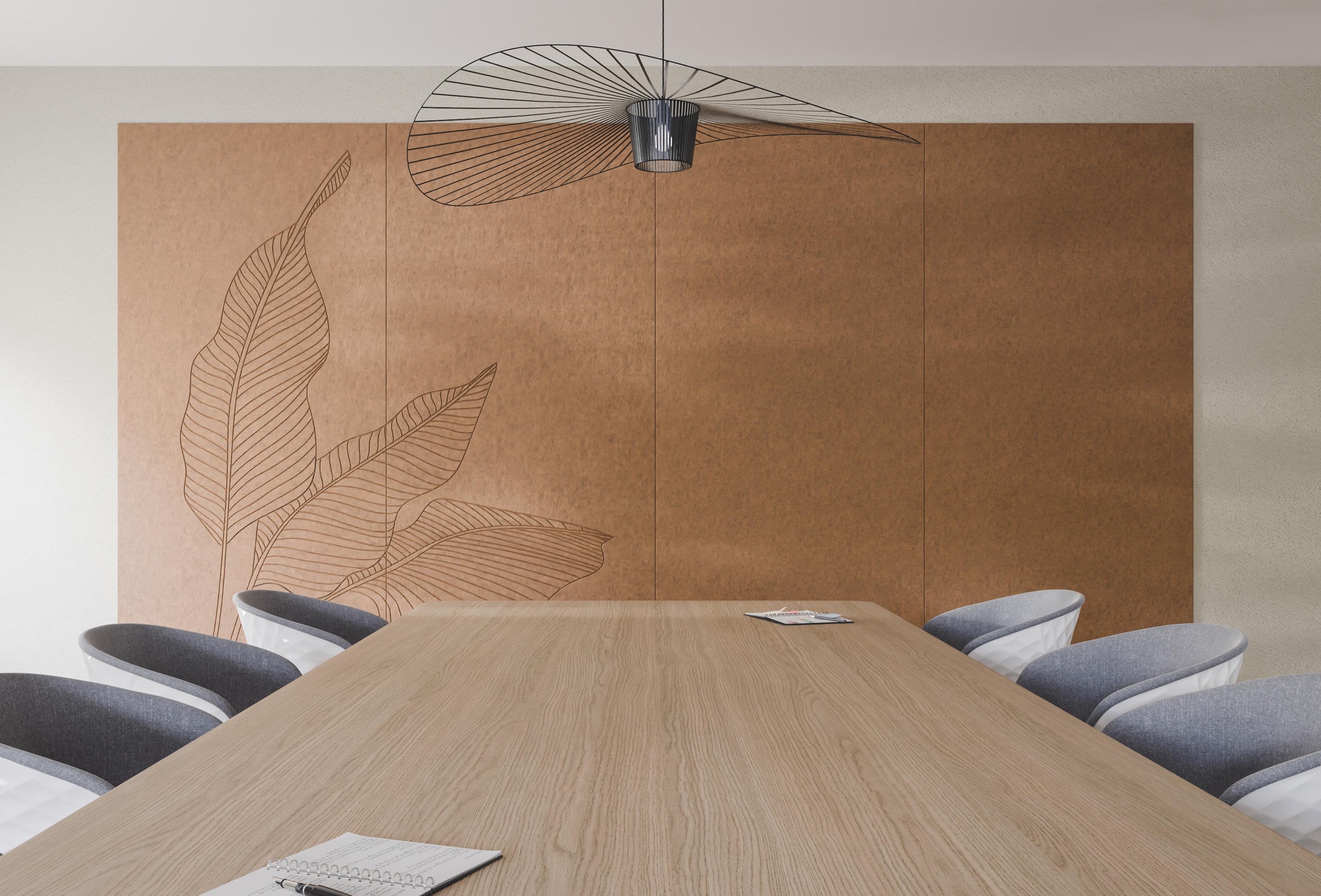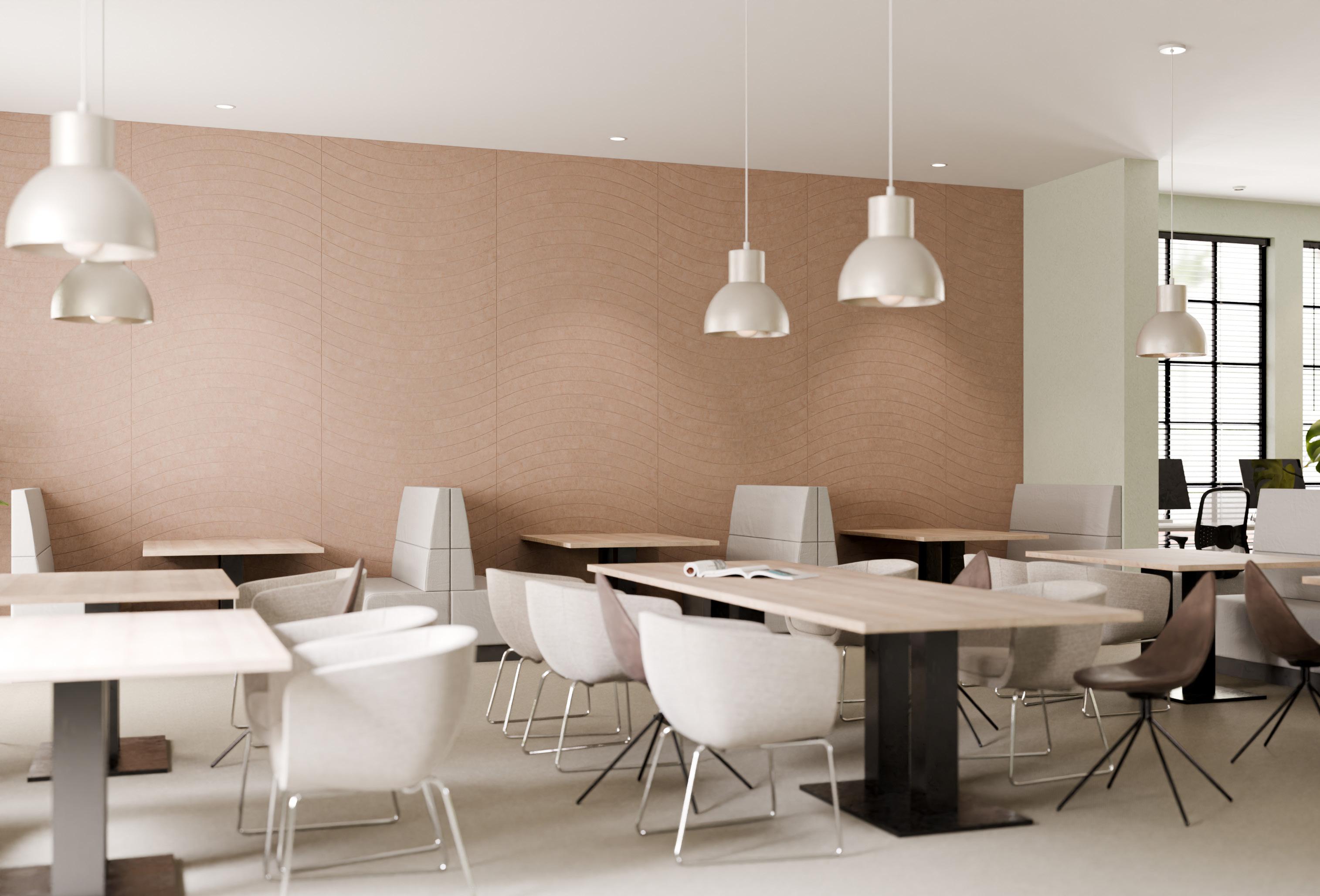 • Een PET-vilt akoestisch paneel met keuze uit 21 kleuren (zie p. 31) en optioneel een bedrukking (enkel op White - P001) of het V-cut patroon DP01.