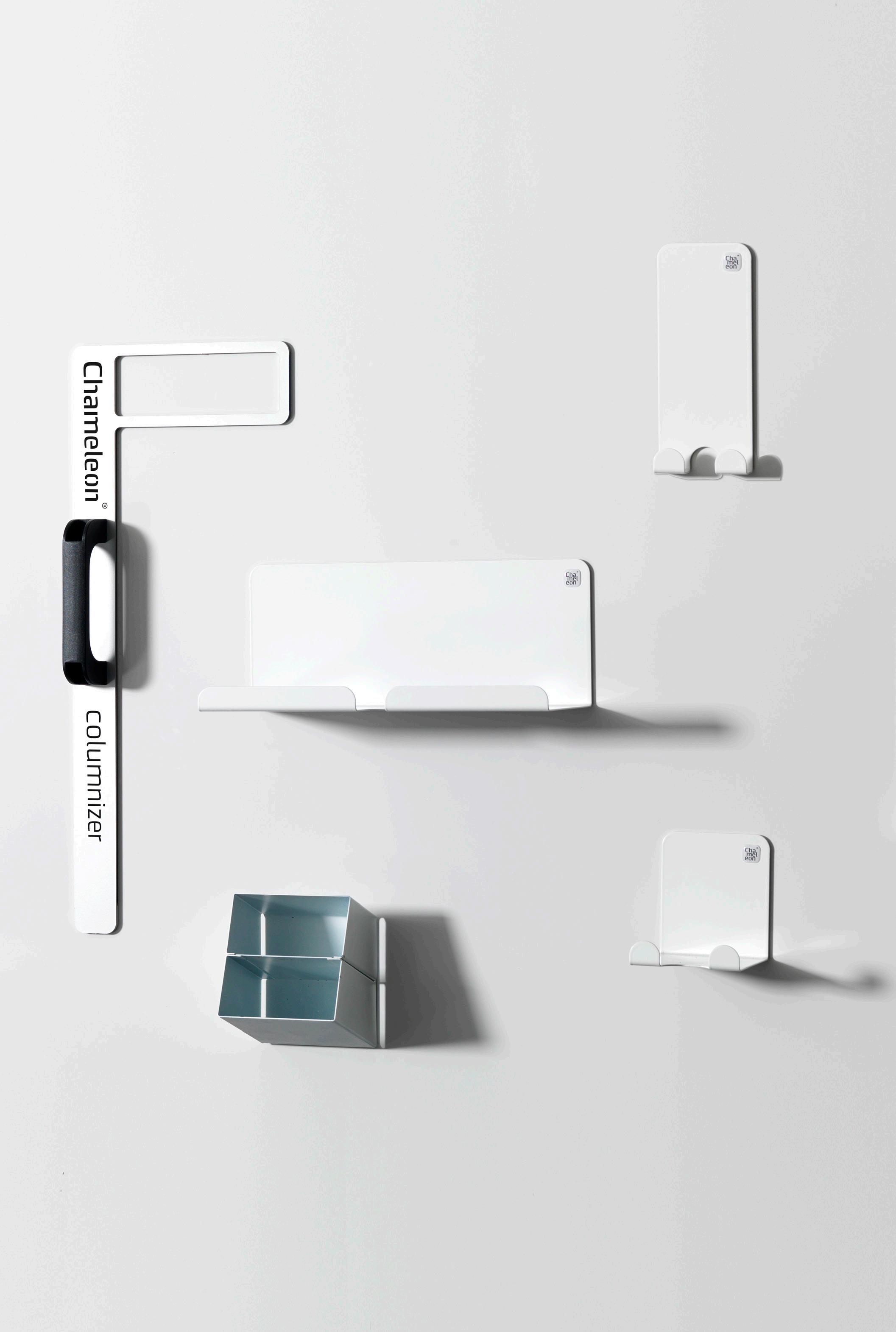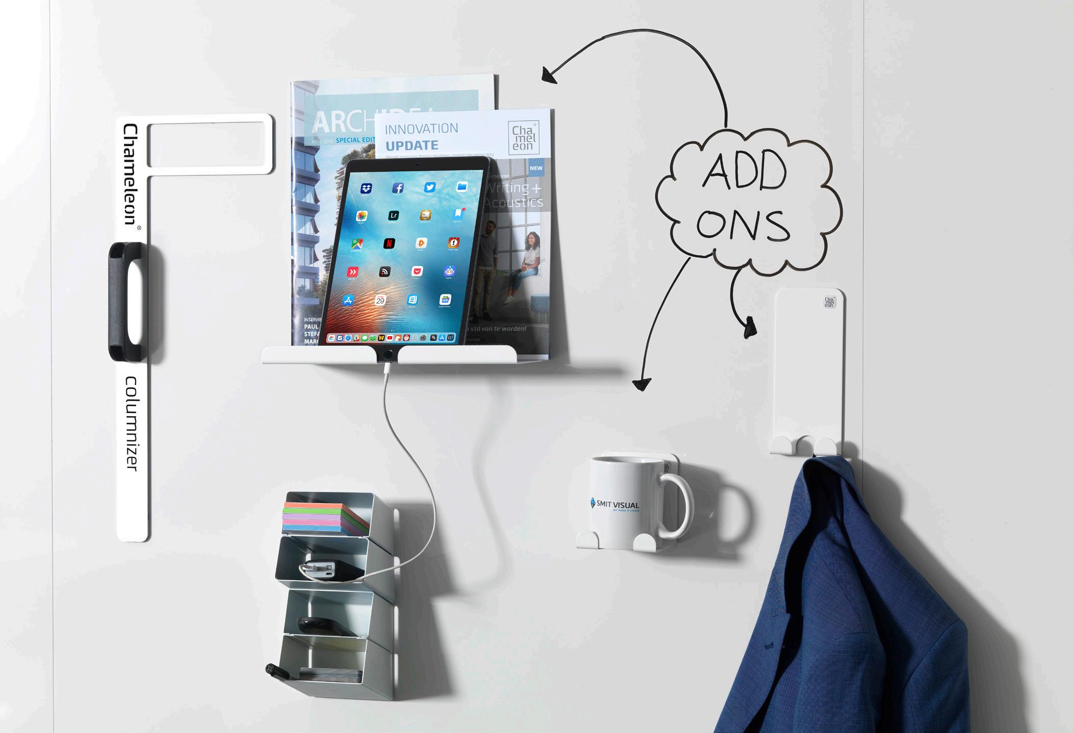 Deze magnetische whiteboard accessoires voegen sfeer en functionaliteit toe aan een whiteboard (wand). Zo heb je altijd al je spullen bij de hand, zoals je geeltjes, je tablet, je telefoon en zelfs je koffiemok. Je kunt er ook een inspirerend magazine of een hip plantje op zetten. Chameleon Add-ons komen altijd van pas!