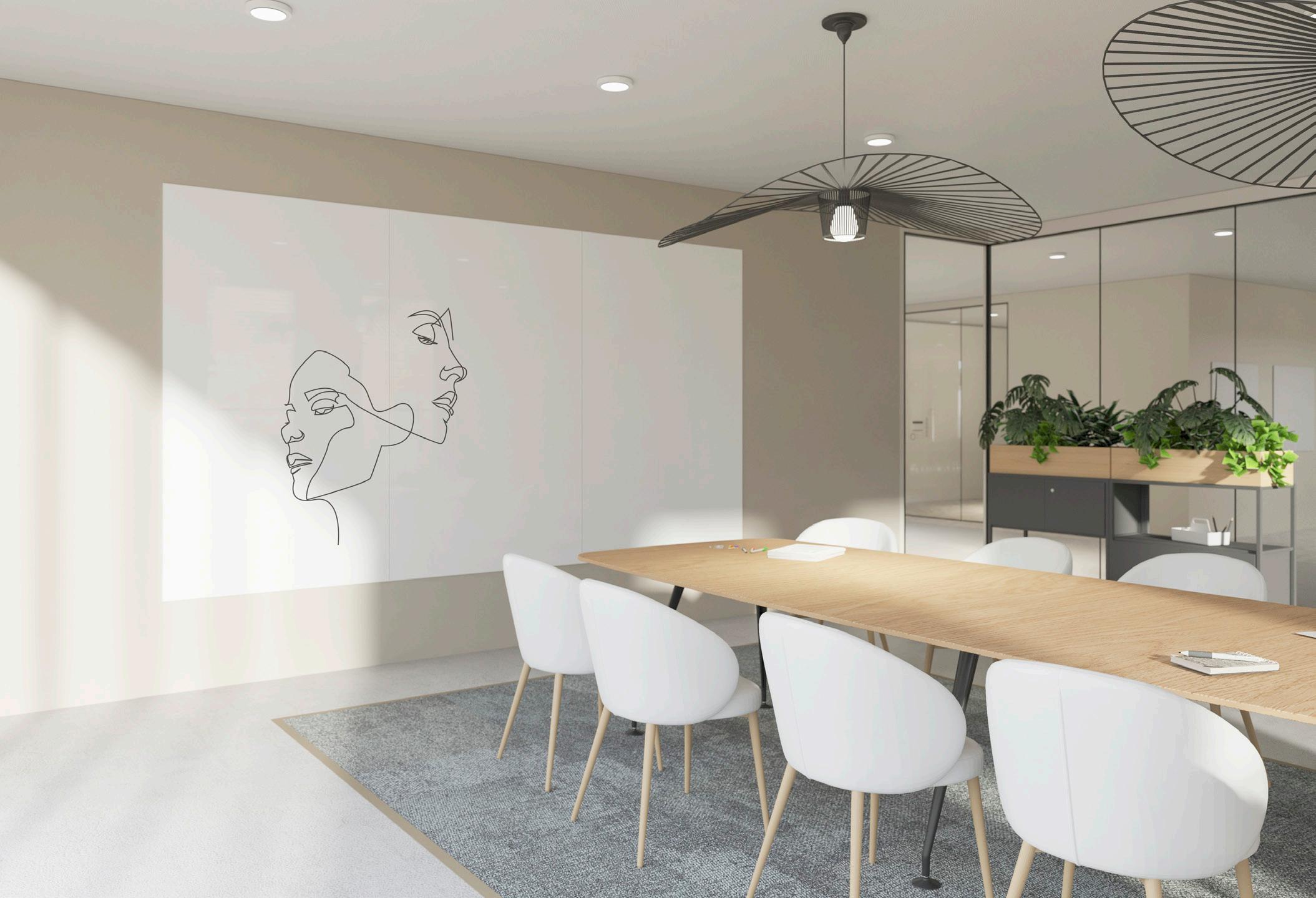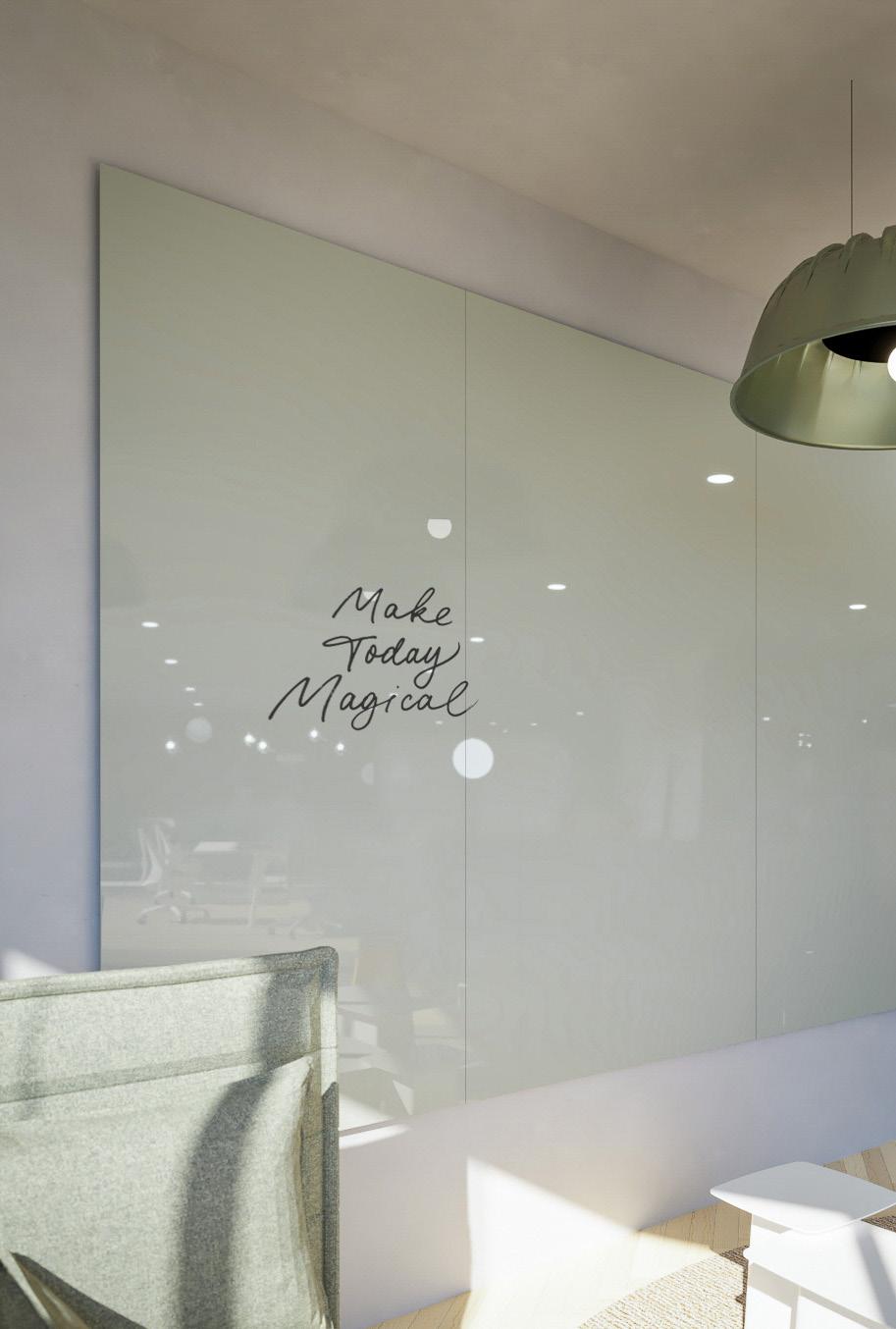 Grote schrijfwand in de meest basale vorm, met rechte hoeken en zonder frame. Door de haarscherpe randafwerking sluiten de panelen nauwkeurig op elkaar aan met een minimale naad. Deze Sharp Wall is leverbaar in 4 verschillende formaten en 5 oppervlak opties. Ook te combineren met Sharp Acoustics, zie pagina 32 - 33.