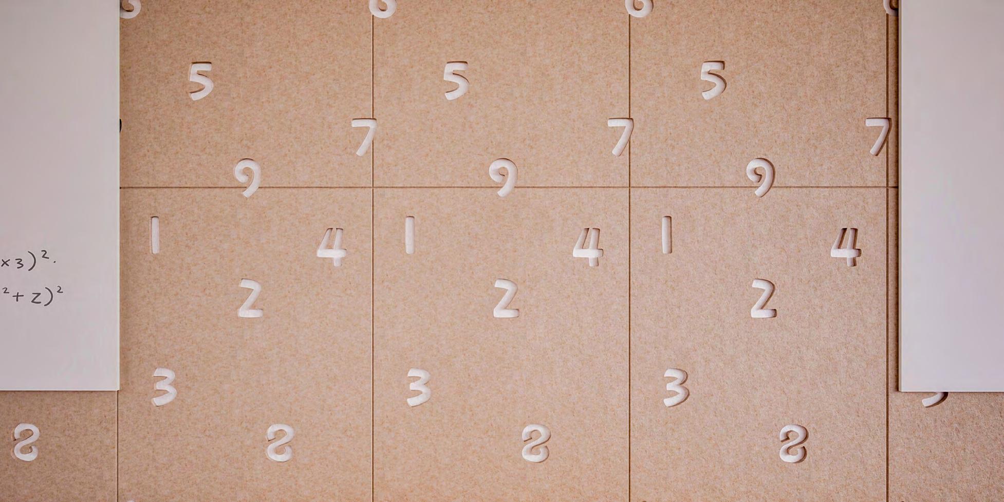 Set of 4 acoustic panels in a fixed size for quick wall coverage. The 18 mm panels consist of two layers of PET felt, with the front layer featuring a pattern designed for education and childcare environments. This reveals the rear layer, creating a two-tone or subtle 3D effect. The edges are bevel-cut. Panels can be easily trimmed on-site to fit. Available in 23 different colours (p. 46).