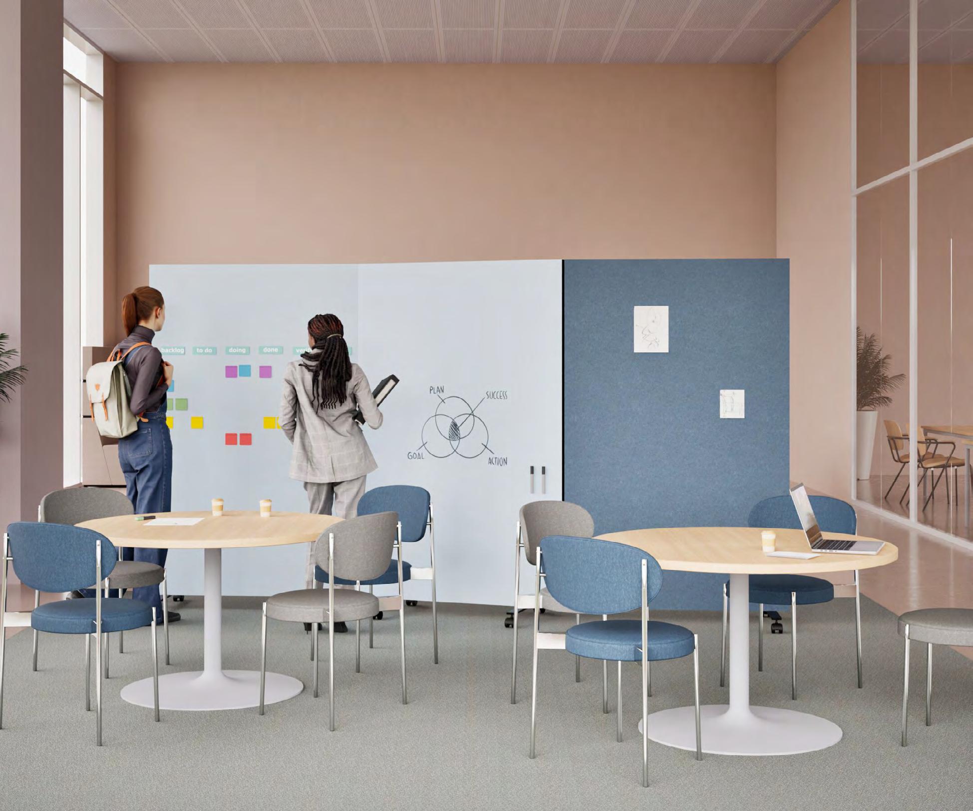 Chameleon Pebbles Acoustics bring calm to busy learning environments. The playful shapes absorb disruptive sounds and turn any school wall into a source of inspiration. Choose from a range of colours (p. 46) and layouts to enhance atmosphere, comfort and concentration in classrooms, corridors or learning zones. Combine with Pebbles whiteboards (pp. 22–23).
