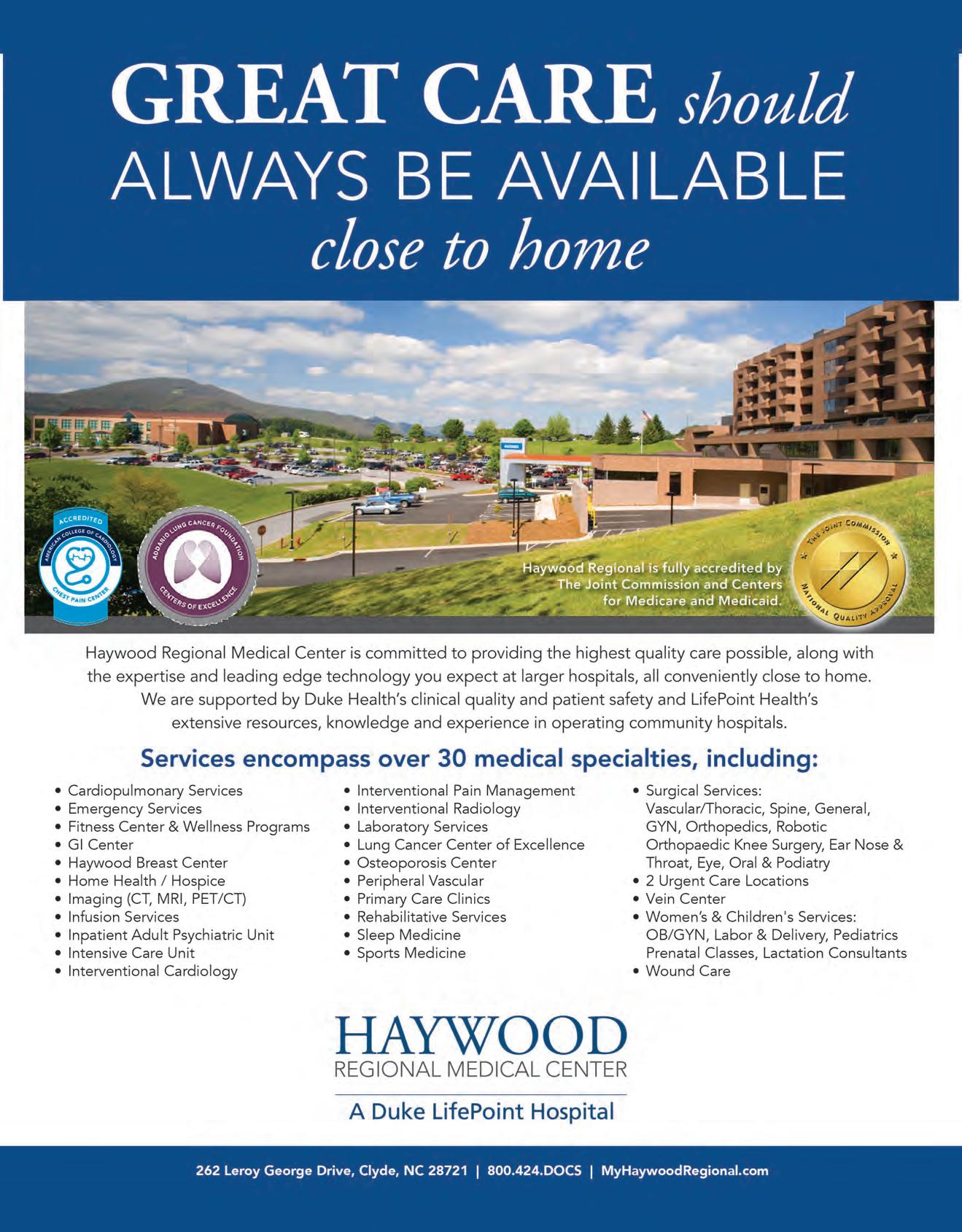 Haywood Regional Medical Center 262 Leroy George Dr. • Clyde, NC 28721 (828) 456-7311 kim.jackson@haymed.org www.myhaywoodregional.com