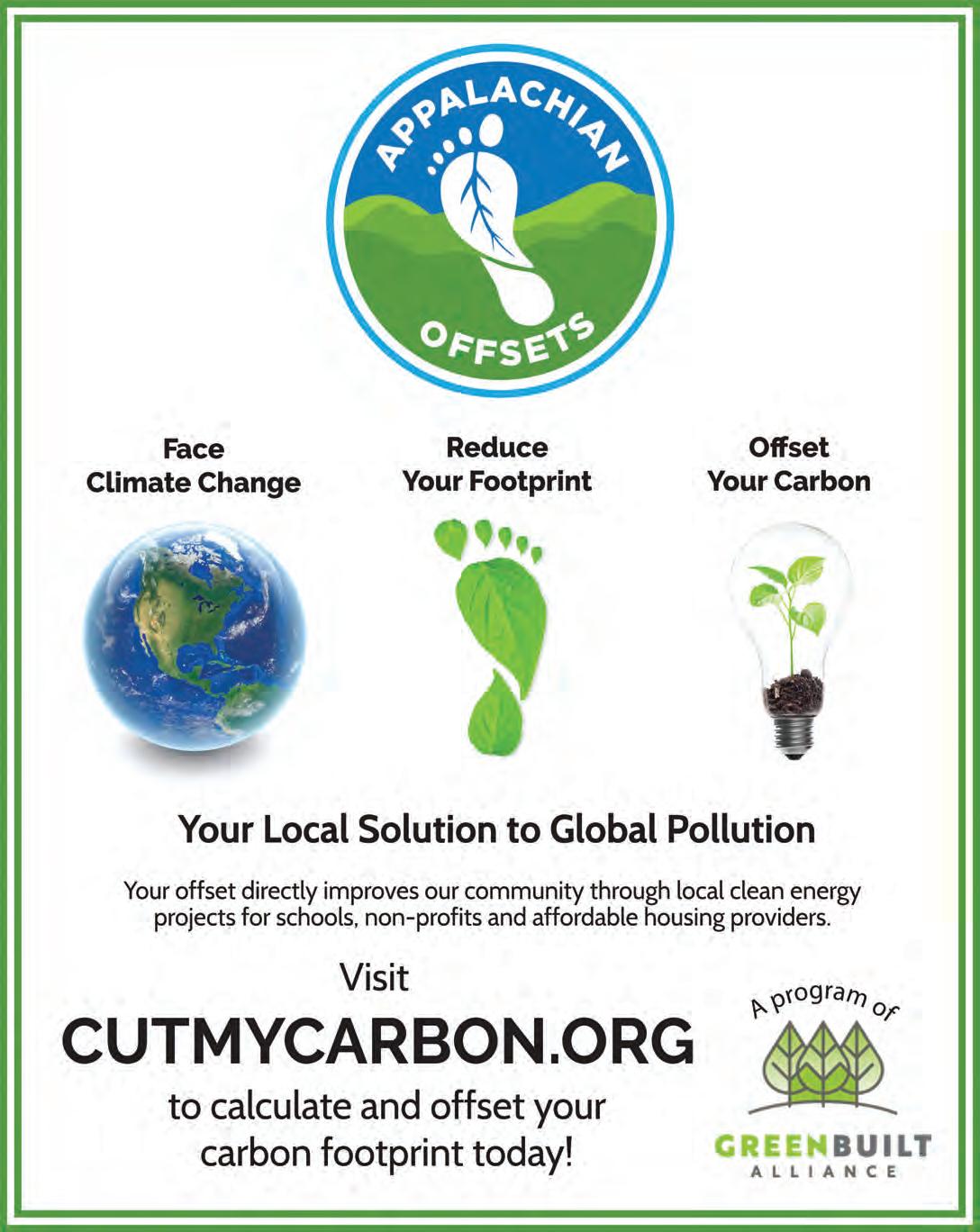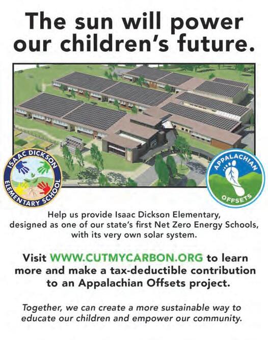 n In August 2018, our Appalachian Offsets program completed its largest campaign to date in raising $220,000 to install a solar system at Isaac Dickson Elementary School in Asheville. Our voluntary offset program also installed a touchscreen kiosk at Asheville Regional Airport in June 2018 to encourage travelers to offset the carbon footprint from their flight by donating to support our cleanenergy projects in local schools and nonprofits. Visit cutmycarbon.org to donate and learn more about past and future projects.