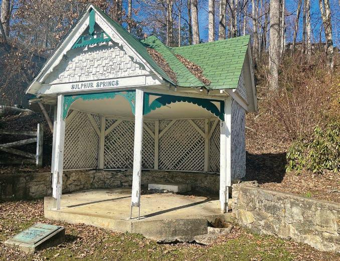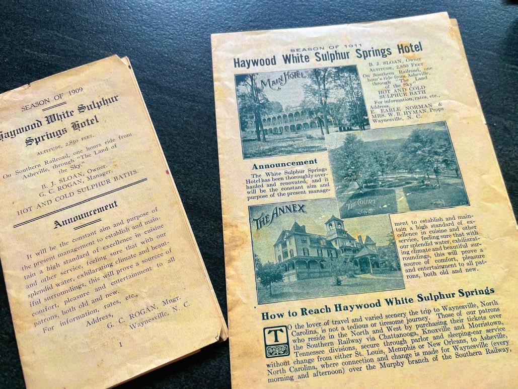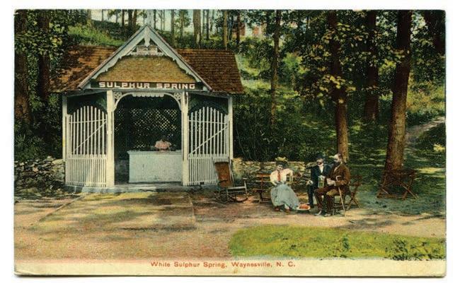 Pamphlets beckon travelers to Waynesville’s White Sulphur Springs Hotel. A postcard (below) from the collection of Alex McKay depicts the springhouse as it would have appeared in the early 1900s.
