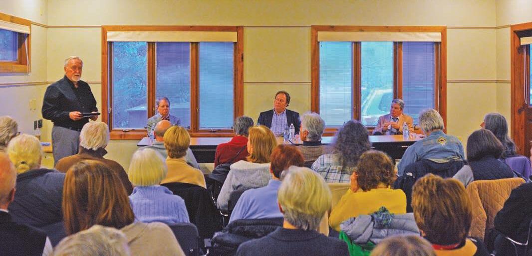 Indivisible Highlands co-leader Steve Kukor (left) introduces Democratic congressional candidates (left to right) Dr. Scott Donaldson, Phillip Price and Dr. Steve Woodsmall. Cory Vaillancourt photo