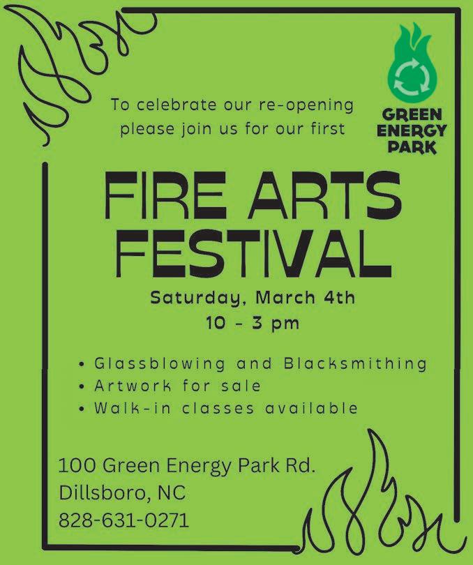 • Green Energy Park will celebrate its reopening with the “Fire Arts Festival” from 10 a.m. to 3 p.m. Saturday, March 4, at the Green Energy Park, half-mile past Huddle House in Dillsboro. For more information visit www.JCGEP.org.