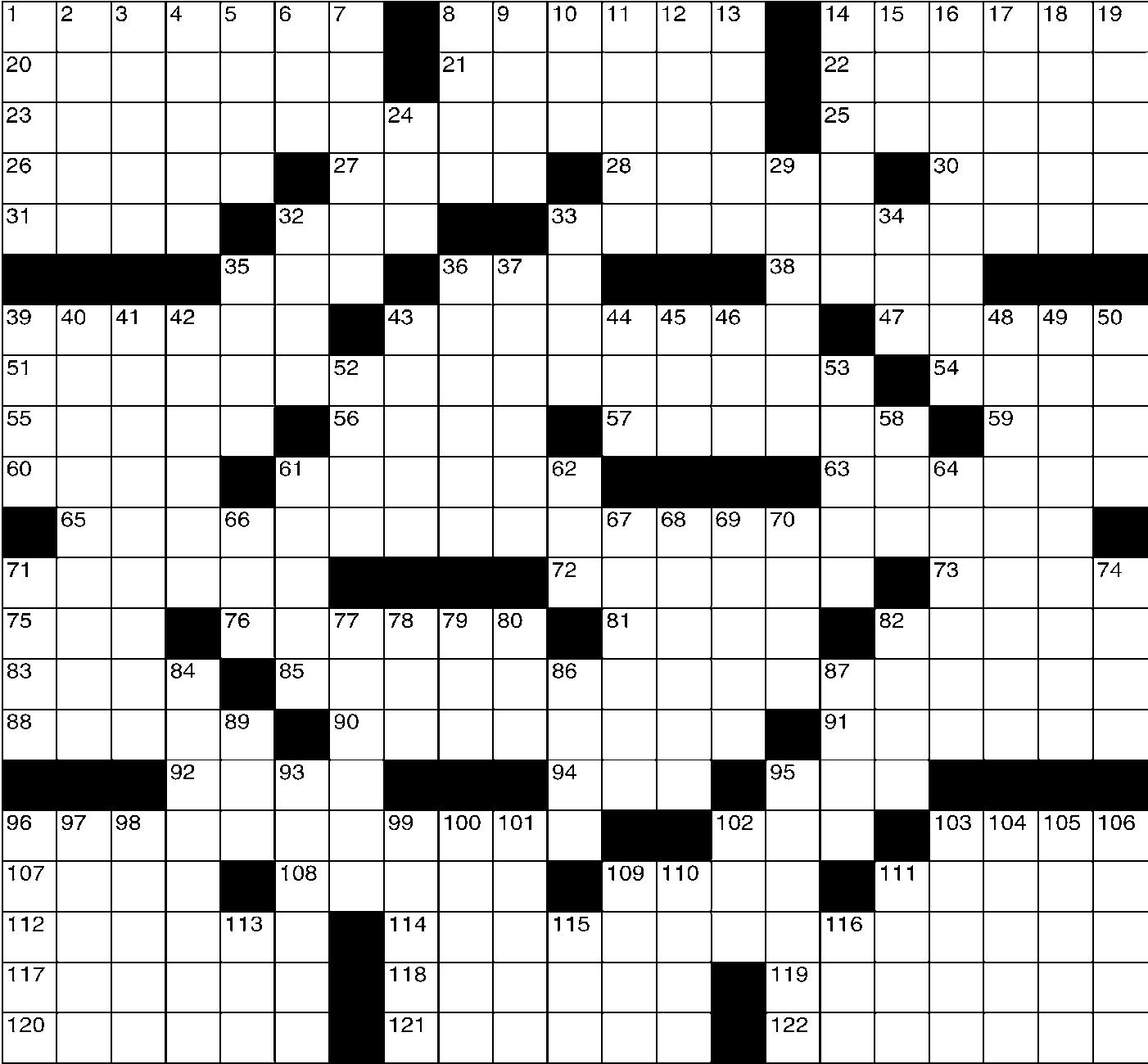 ANSWERS ON PAGE 34 STUDY OF GENESIS ACROSS 1 Downhiller's headwear 8 Mexican beach resort 14 Island home of Odysseus 20 University of Wyoming's city 21 Moon-landing program 22 Had to have 23 They appear before a film's first scene 25 Viewed to be 26 Cakes of cornbread 27 Indy units 28 Bichon -- (white dog) 30 Stitch's cartoon friend 31 Bleating females 32 Speedy plane 33 It turns a computer on 35 Always, to bards 36 Vintage auto 38 Active Sicilian volcano 39 Holders of emergency supplies 43 Women with babies on the way 47 Puccini work 51 Gala after a presidential oath 54 Cutting noise 55 Quadrillionth: Prefix 56 -- epic scale 57 Musical insensitivity 59 Sets for viewing 60 Perfume by Dana 61 Lured 63 "You Gotta Be" singer of 1994 65 Graduation address deliverer 71 Keyless, musically 72 Many a Netflix show 73 "-- Dinka Doo" (Jimmy Durante tune) 75 Candy in collectible dispensers 76 "Mice" or "lice," but not "rice" 81 Blowout, e.g. 82 Look for prey, as a lion 83 Cyber-addresses 85 Membership ceremony 88 Phony: Prefix 90 Camera item for a long or short view 91 Down Under dweller 92 "Me? Never!" 94 -- Cruces 95 Says "yes" to 96 Celebratory event for a rollout 102 Swung tool 103 Green gem 107 Prefix with directional 108 Cosmetician Lauder 109 Saintly 111 Birds-and-bees class 112 Stick together 114 Bible's first words (apt for this puzzle's theme) 117 Actress McNichol or Swanson 118 Quarterback great Dan 119 Flow out 120 Smallish sofa 121 Slip away 122 City in Arizona or Mexico DOWN 1 Inclined land 2 "Bam!" 3 Singer Cara 4 Lion features 5 French buds 6 Moral failure 7 Bowler, informally 8 Koi, e.g. 9 Clumsy sorts 10 Signal "yes" 11 Actor Montgomery 12 Radical sort 13 GI's "Uh-uh!" 14 Owing money 15 PGA peg 16 Shoe lifts 17 Grant entry to 18 Singer/rapper Green 19 Attach 24 Purring pet 29 "Remington --" 32 Bach's "--, Joy of Man's Desiring" 33 Mediocre 34 108-card game 35 Frozen waffle brand 36 Move in circles 37 "Lose Yourself" rapper 39 Natural ability 40 Many short plays 41 Hoodwink 42 One of the four seasons 43 Wildly excited 44 Blast stuff 45 Sapporo sash 46 Prohibit 48 Just between us 49 Stream in the title of 1957's Best Picture 50 Church area 52 Horse color pattern 53 Fills with freight 58 Irish actor Stephen 61 Lawyer Melvin called "The King of Torts" 62 -- Moines 64 Minis, midis and maxis 66 GPS display 67 Tetley competitor 68 Bridal gown features 69 Grain towers 70 Hammer's striking end 71 Since Hector was -74 Everybody, in Essen 77 Starts to remove a jacket, say 78 -- de Janeiro 79 -- -Z (total) 80 Fashion designer Phillip -82 Name shared by 12 popes 84 Least cloudy 86 Join forces 87 Fall lawn tool 89 Rx writer 93 A flirtatious look 95 Element #8 96 Safe securers 97 Love, in Italy 98 Not stricken 99 -- or two (on occasion) 100 Kidney-related 101 "Neon" fish 102 Schooner fill 103 One of the Bush twins 104 Around a line of symmetry 105 Al -- (a bit firm) 106 Knife features 109 Birds sitting on clutches 110 Conical-bore woodwind 111 Hosiery flaw 113 GPS display: Abbr. 115 Trendy 116 "It seems to me," online